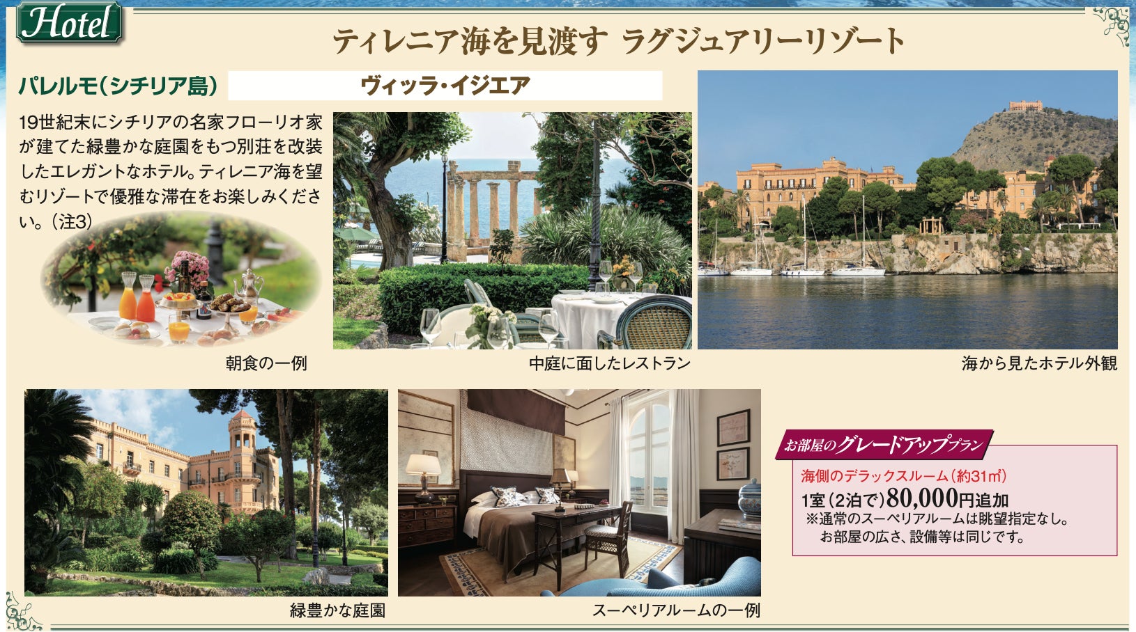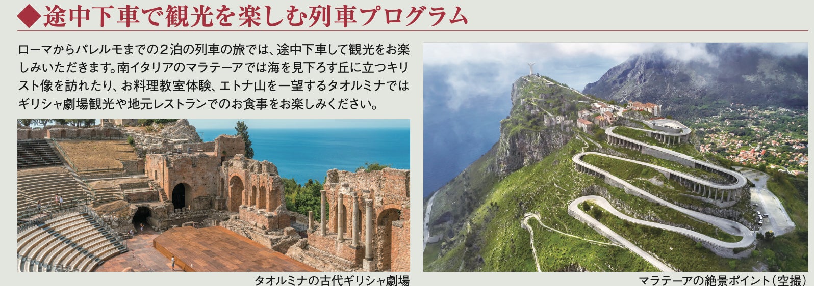 南イタリアのマラテーアは丘の上にある村で、海を見下ろす絶景をお楽しみいただきます。シチリア島のタオルミナでは古代ギリシャ劇場を観光し、地元レストランでのお食事をお楽しみください。