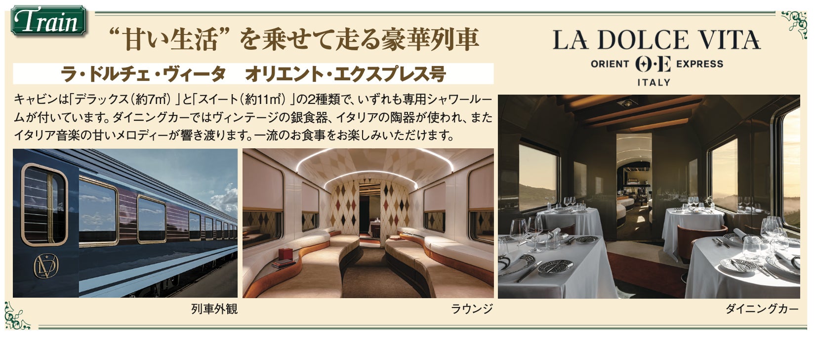 2025年、イタリアに新たな豪華寝台列車オリエント・エクスプレスが運行を開始します。列車はイタリアン・デザインで洗練された雰囲気と優雅さ、そしてホスピタリティ溢れるスタッフによる一流のサービスです。