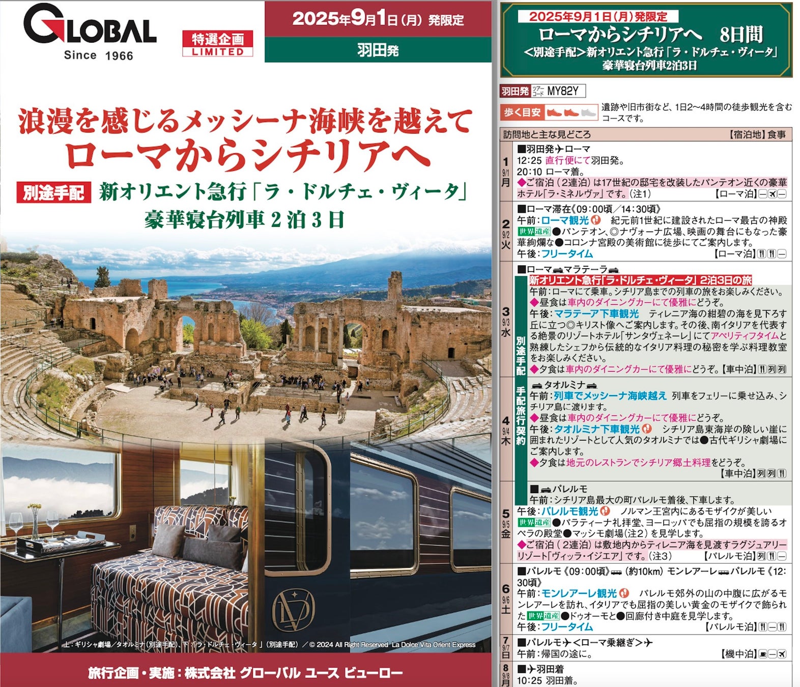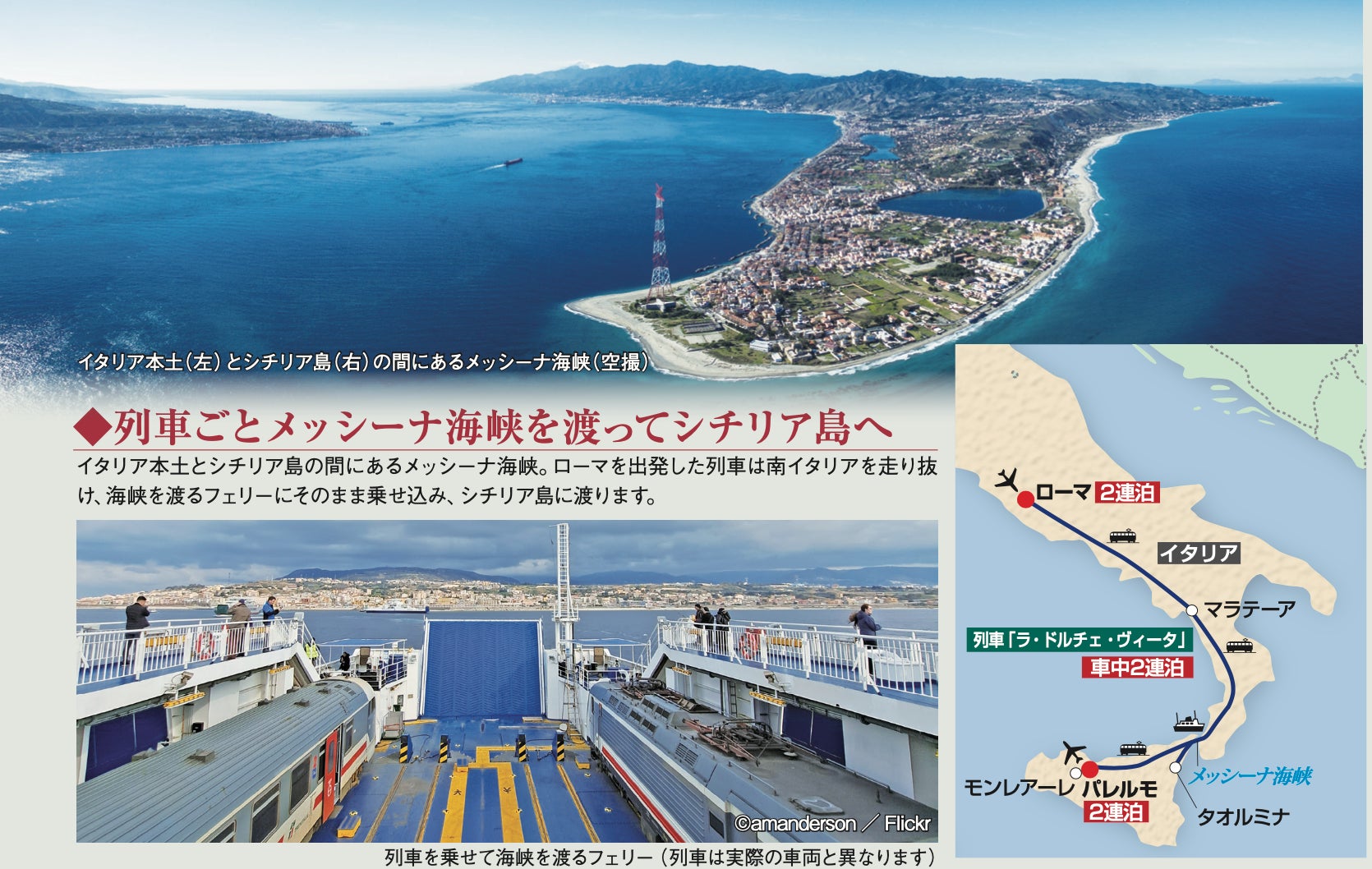 列車はいくつかの運行ルートがありますが、グローバルが選んだのはローマからシチリア島へ、途中メッシーナ海峡を列車を乗せたまま船で渡る2泊3日のルートです。イタリア半島のつま先のメッシーナ海峡では列車ごとフェリーに乗り込みシチリア島に渡るのは、このルートならではの体験です。
