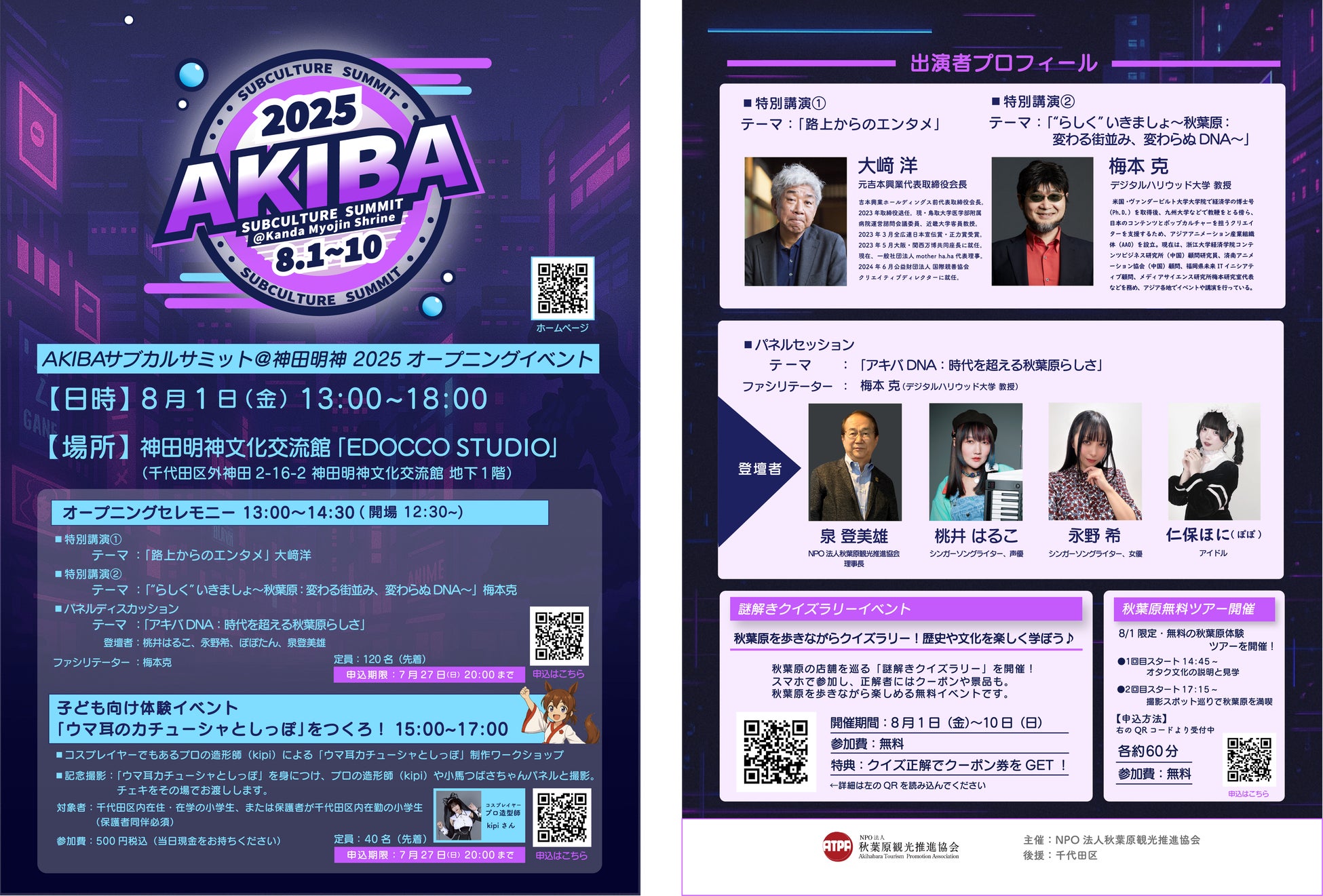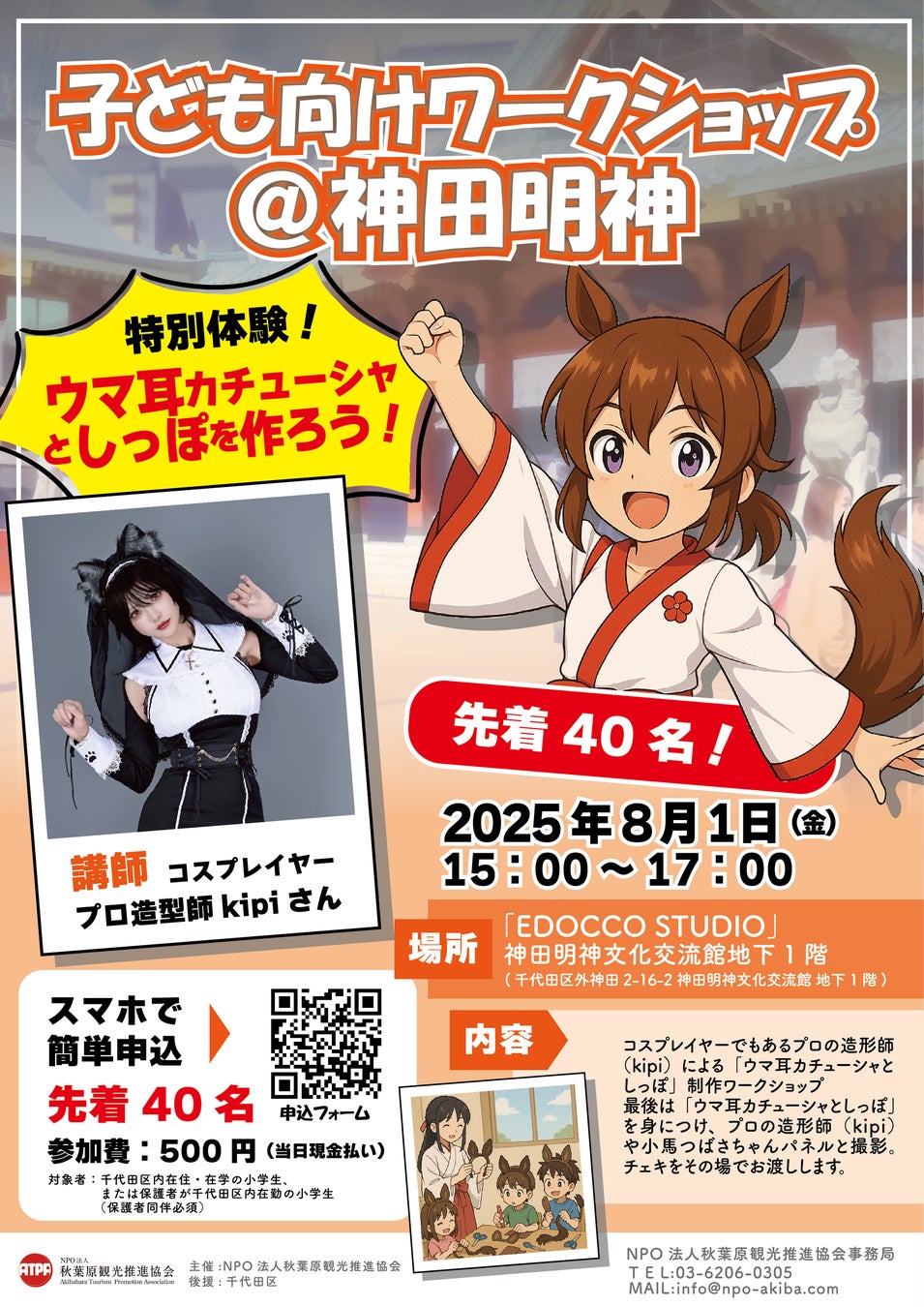 NPO法人秋葉原観光推進協会(ATPA:理事長 泉登美雄)は、2025年8月1日(金)に開催される「AKIBAサブカルサミット@神田明神2025」の一環として、**千代田区の小学生とその保護者を対象とした夏休み親子ワークショップ「ウマ耳カチューシャ&しっぽ制作体験」**を実施いたします。