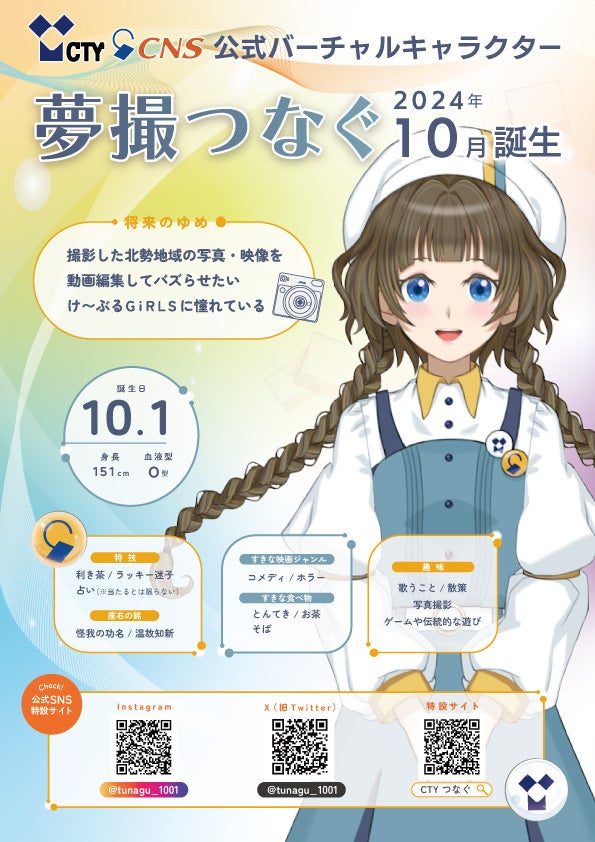 【概要】CTY・CNSでは、デジタル化を推進するため、バーチャルキャラクターを「バーチャル社員」として採用し、 ケーブルテレビCTY ・CNSのシンボル的な広報役として、あらゆるデジタル接点の場面で活動していきます。