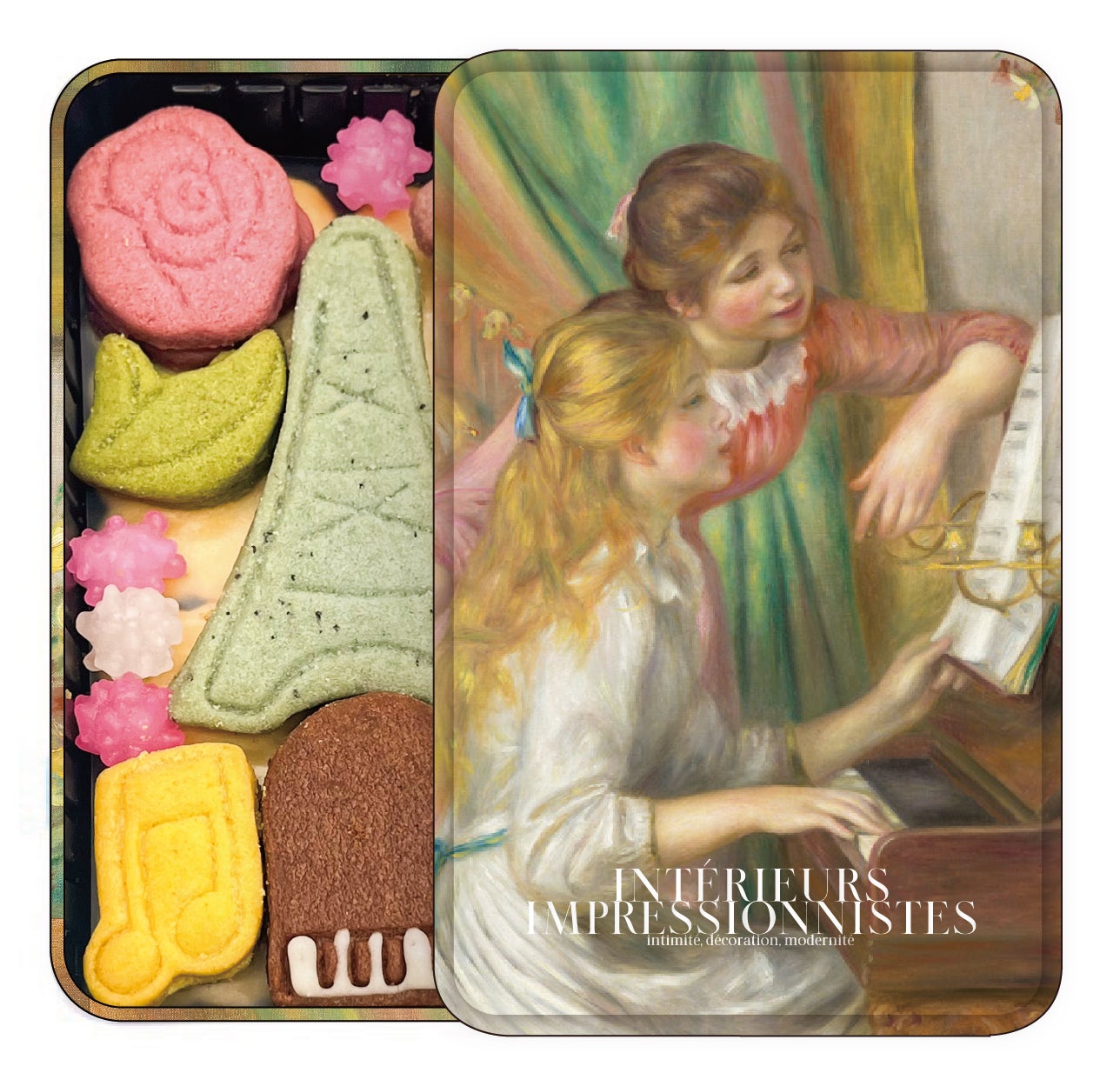 ルノワールの《ピアノを弾く少女たち》をあしらった本展オリジナルの缶の中には、パリやピアノから連想されるかわいいサブレが詰まっています。