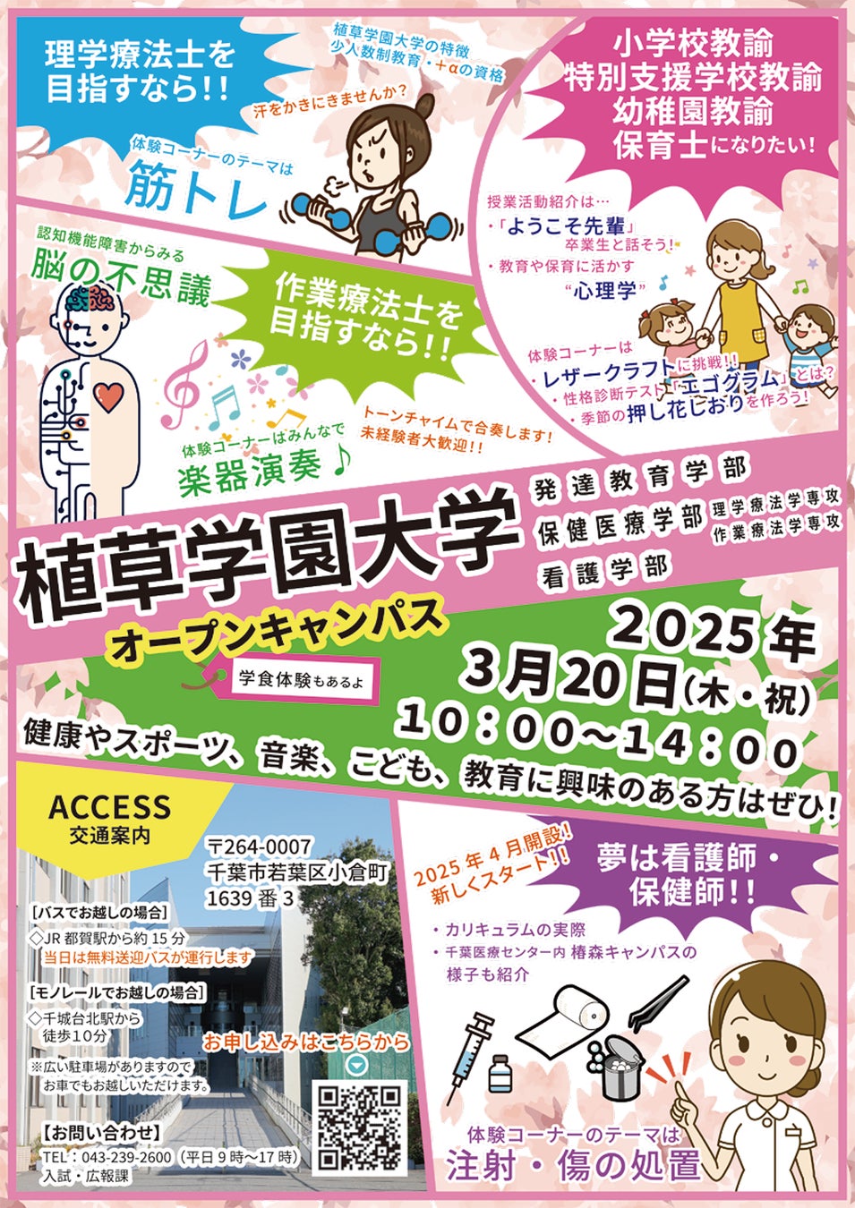 植草学園大学(千葉市若葉区)では、3月20日(木・祝)に春のオープンキャンパスを開催します。