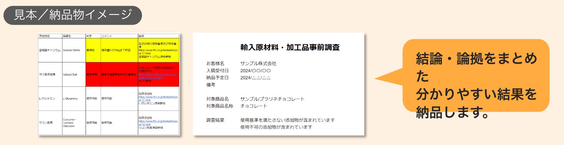 取り扱い輸入食品の添加物・原材料・加工品の項目が日本基準に則しているかの事前調査を行うサービスです。栄養価計算・アレルギー表示込で表示義務範囲を網羅しています。