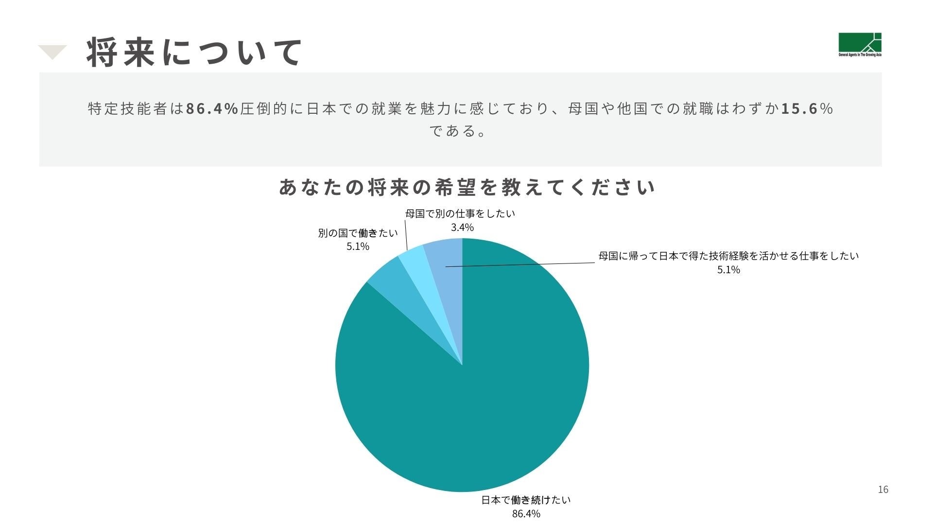 特定技能者は86.4%圧倒的に日本での就業を魅力に感じており、母国や他国での就職はわずか15.6%である。
