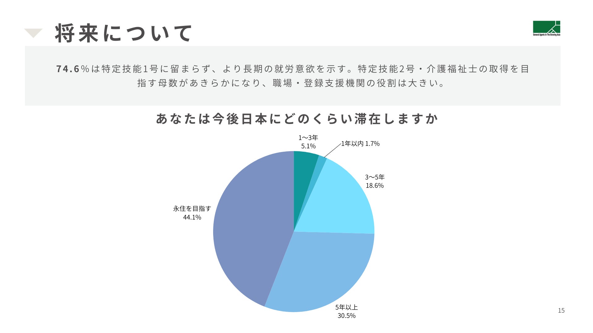74.6%は特定技能1号に留まらず、より長期の就労意欲を示す。特定技能2号・介護福祉士の取得を目指す母数があきらかになり、職場・登録支援機関の役割は大きい。