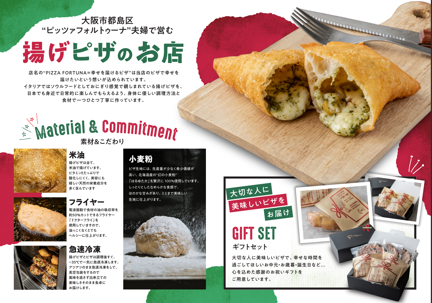 関西ではまだ珍しい“揚げピザ”が名物のピッツァフォルトゥーナは、夫婦で営む小さなレストランです。2018年にオープンし、昨年よりオンラインストアを開設しました。