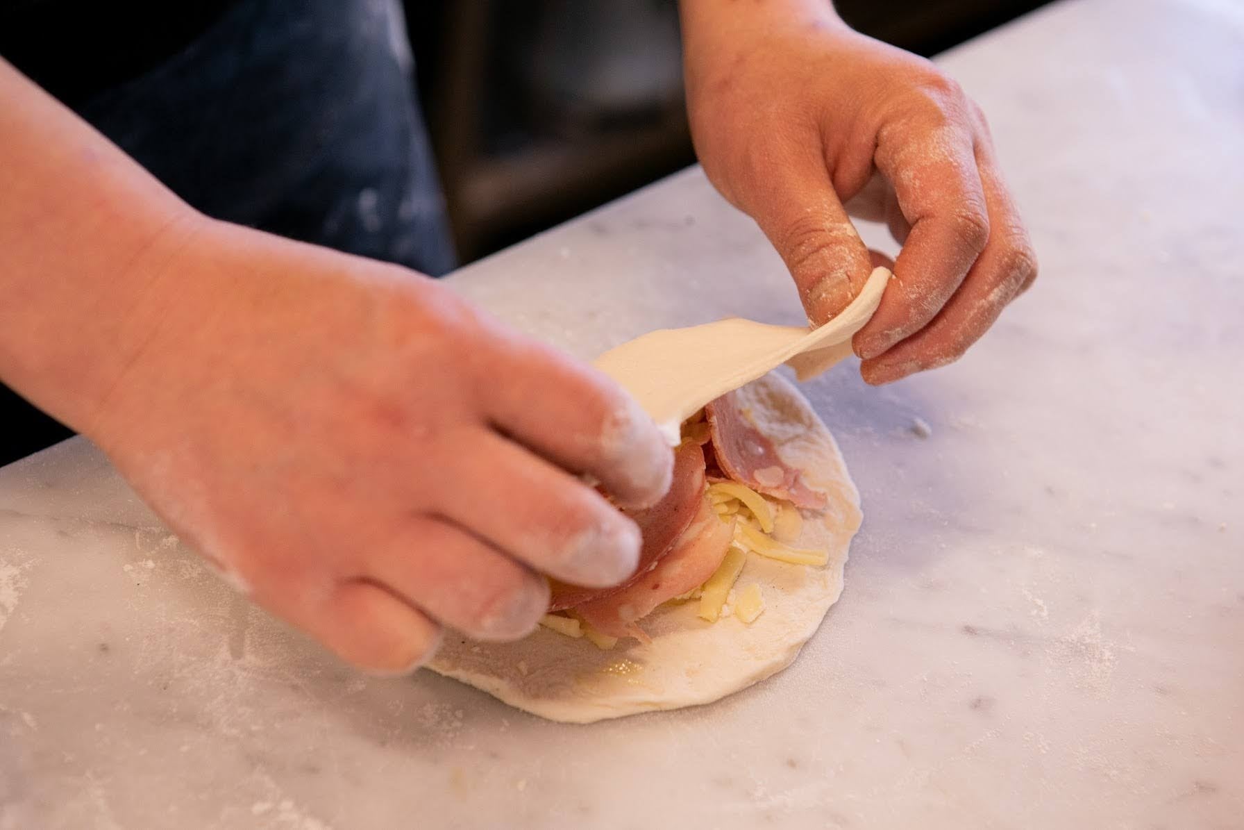 ・カリカリ食感の包み焼きピザ イタリアが生んだイタリア風ホットサンド。ピザ生地に具材を包んで折り畳み三日月形にして焼いた料理。片手で食べられるので、食べ歩きやアウトドアにも人気です。