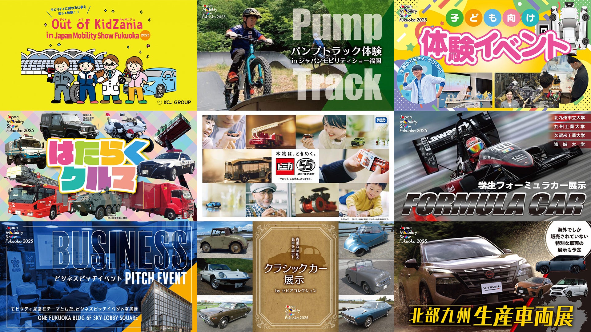 会場では、 ドローンショー展示以外にもご家族で楽しめるコンテンツが多数開催されます。 自動車産業に関わる仕事を体験できる 「キッザニア」や科学 体験イベントを始め、「はたらくクルマ」や「クラシックカー」 など様々なジャンルの車を集めたスペシャル展示、 コース上の凸凹を二輪車で楽しむパンプトラック体験など、 子どもも楽しめるコンテンツが盛りだくさん。 会場限定 「トミカ」 の販売や展示も!
