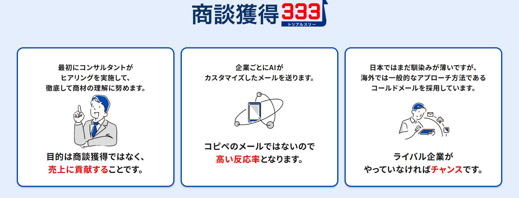 「商談獲得333(トリプルスリー)」は、商材の理解に時間をかけ、ニーズを引き出しながら売上にスムーズにつながるような設計で商談を獲得していきます。