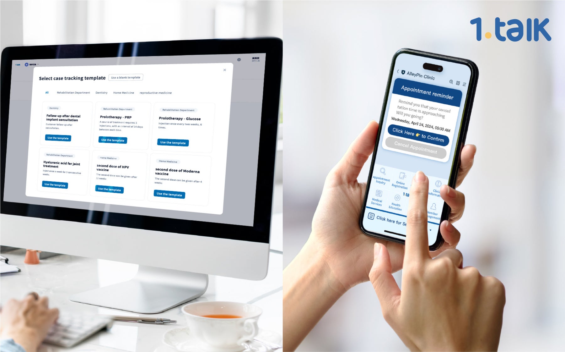 1.Talk は、クリニックのLINE公式アカウントを通じて、患者が予約を取ったり、リマインダーを受け取ったり、パーソナライズされた健康アドバイスにアクセスしたりすることを可能にする。