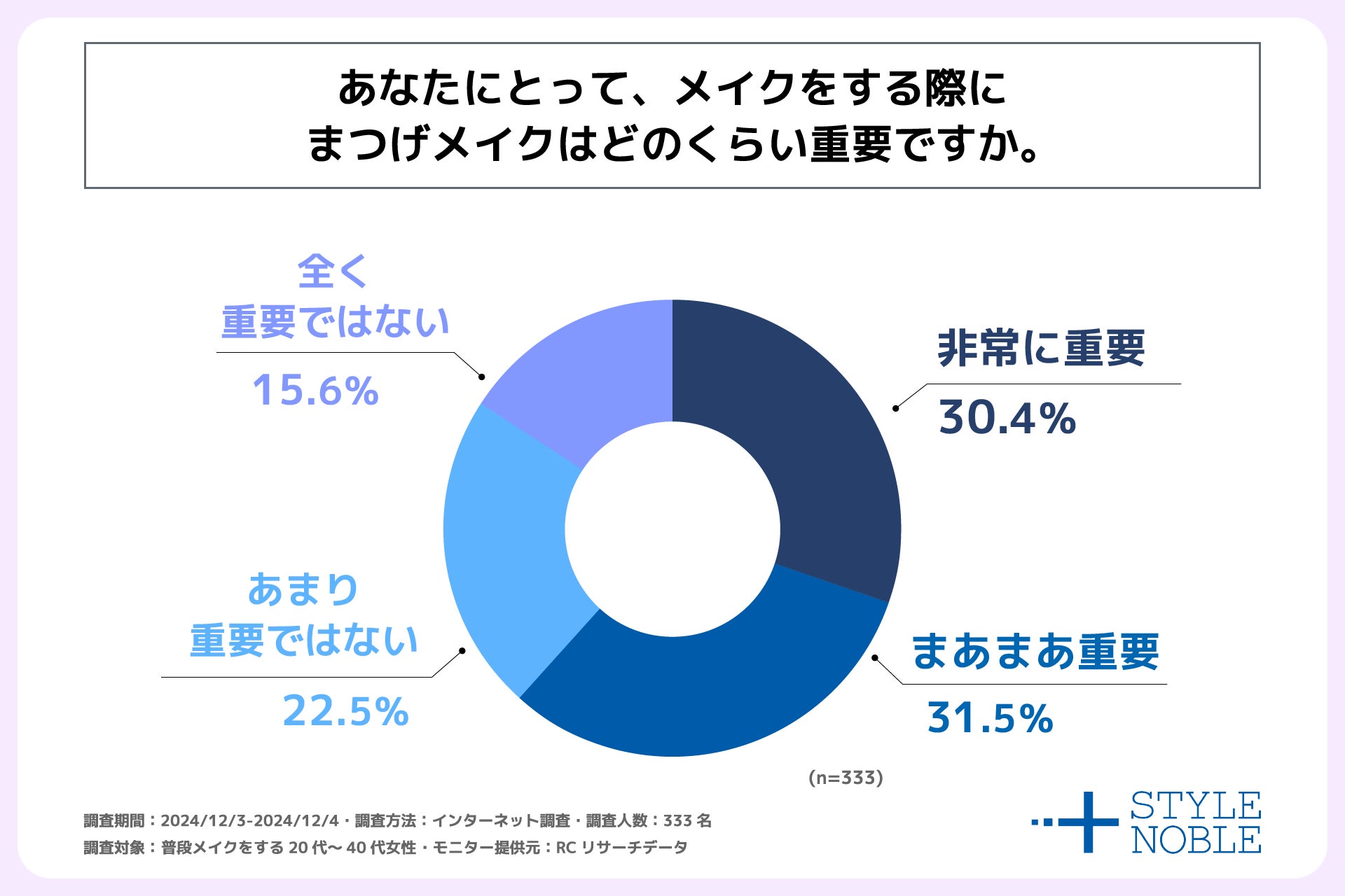 年末年始のイベントシーズンが目前に迫り、冬ならではのファッションやメイクを楽しまれる方も多いことでしょう。年末年始は人と会う機会も多く、外出時のメイクにも一層こだわりが高まる季節です。また、普段重点的にメイクするパーツといえば「アイメイク」と答える女性も多いものと思われます。中でも、目元の華やかさを決定づける重要な要素として「まつげメイク」が挙げられますが、現代の女性たちはどのような「まつげメイク」を行っているのでしょうか。そこで、ノーブル株式会社は、普段メイクをする20代~40代女性を対象に「まつげメイク」に関する実態調査を実施しました。