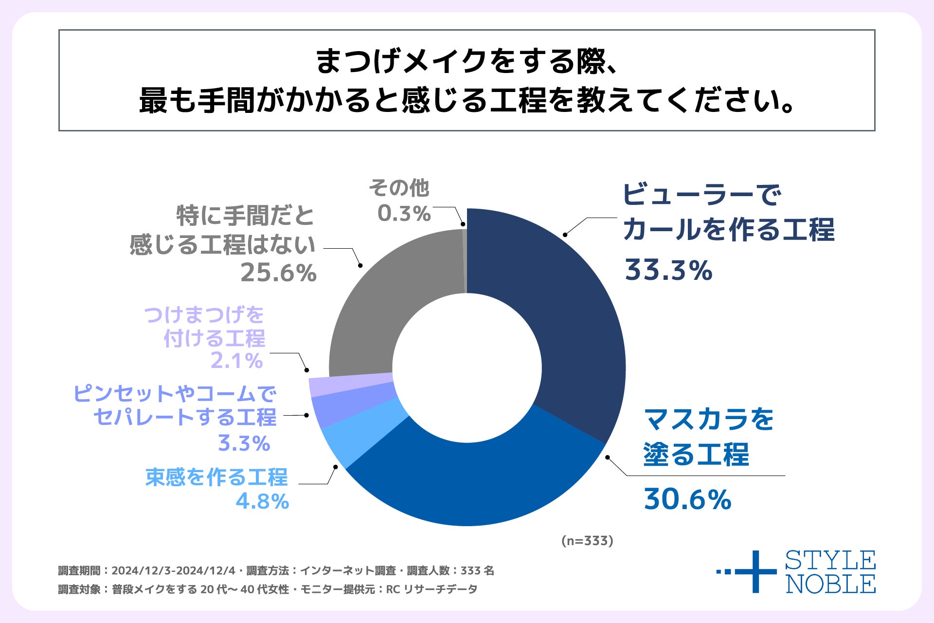 次に「まつげメイクをする際、最も手間がかかると感じる工程」を問う設問への回答では1位が「ビューラーでカールを作る工程」で33.3%、2位が「マスカラを塗る工程」で30.6%という結果になりました。まつげメイクにおいては「きれいなカール」に仕上げることを重要視する人が多いからか、「ビューラーでカールを作る工程」に最も手間がかかると感じる方が多いことがわかりました。