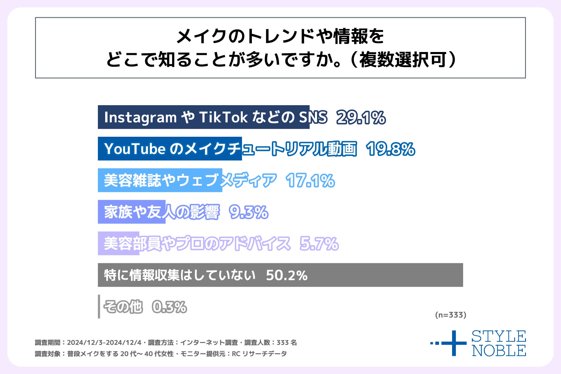 調査の最後、「メイクのトレンドや情報をどこで知ることが多いか」を尋ねる設問への回答で最も多かったのは1位が「特に情報収集はしていない」で50.2%、次いで2位が「InstagramやTikTokなどのSNS」で29.1%、3位が「YouTubeのメイクチュートリアル動画」という結果となりました。この結果から、情報収集を積極的にしていない人も半数程度いるものの、積極的にしている人はSNSを情報源としている人が多いことが明らかになりました。