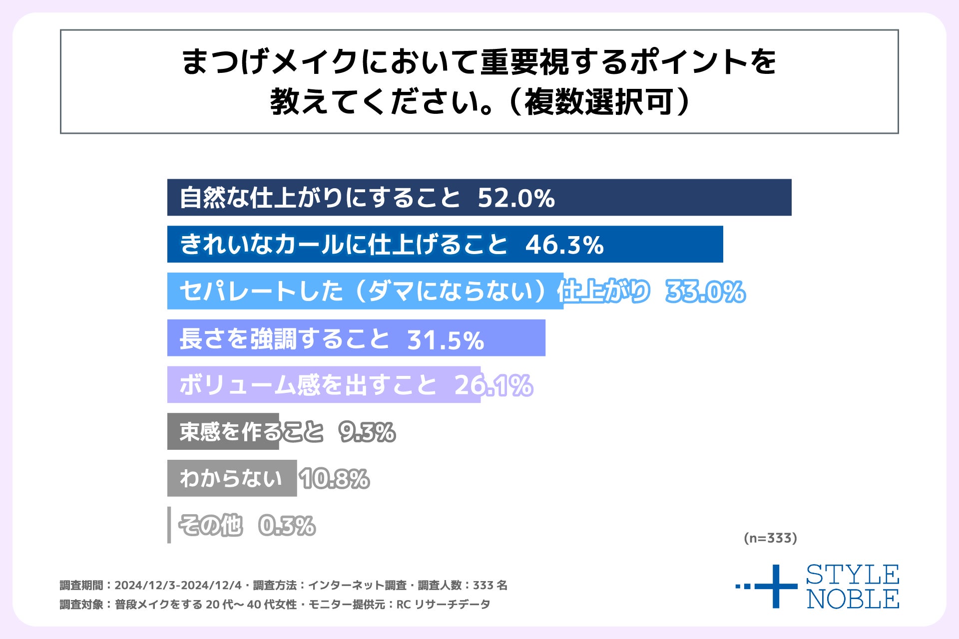 次に「まつげメイクにおいて重要視するポイント」を尋ねる設問への回答で、最も多かったのは1位が「自然な仕上がりにすること」で52.0%、2位が「きれいなカールに仕上げること」で46.3%、3位が「セパレートした(ダマにならない)仕上がり」で33.0%という結果になりました。この結果から、まつげメイクはナチュラルであると共に、きれいなカールとまつげ1本1本がセパレートした仕上がりになることを重要視する人が多いことが判明しました。