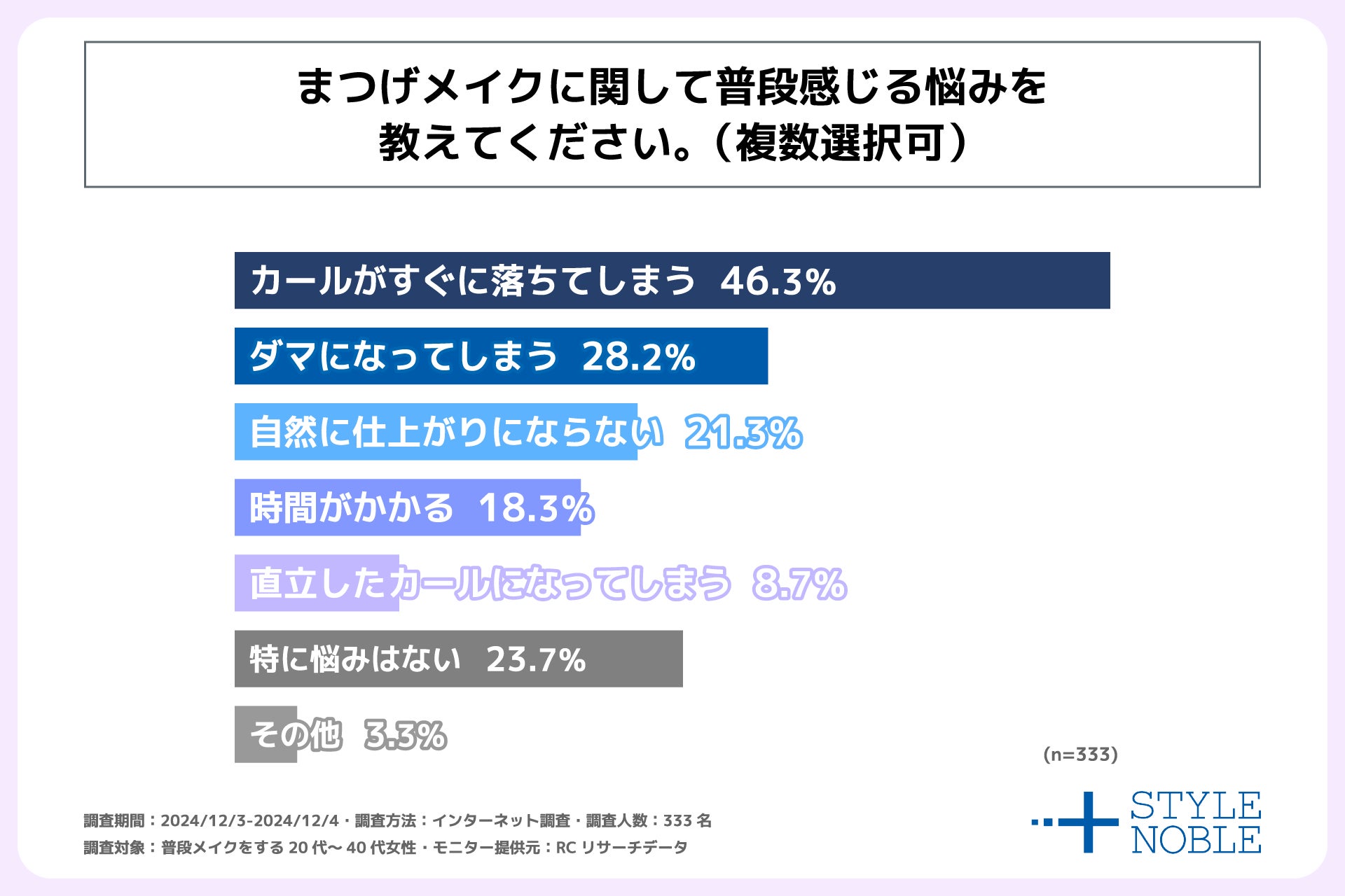 また「まつげメイクに関して普段感じる悩み」を尋ねる設問への回答では、1位が「カールがすぐに落ちてしまう」で46.3%、2位が「ダマになってしまう」で28.2%という結果となりました。ここではまつげメイクで重要視するポイントで上位にきた回答を阻害するようなものが悩みの上位にくる結果となりました。