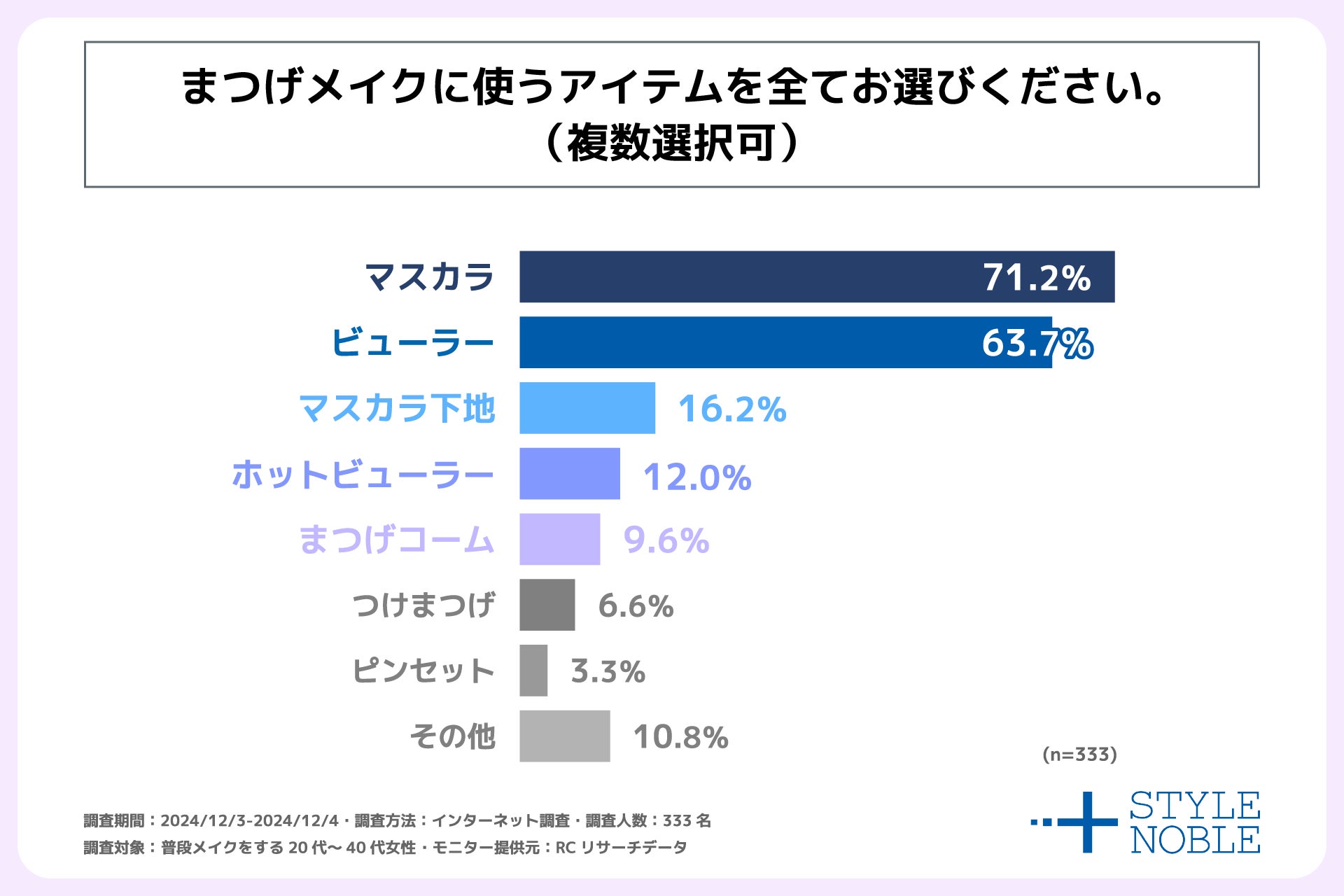 続いて「まつげメイクに使うアイテム」を全て選んでもらう設問への回答では、1位が「マスカラ」で71.2%、2位が「ビューラー」で63.7%という結果になりました。この上位2つのアイテムを使用する方が多数派ではあるものの、3位以降も数パーセント~十数%の回答率で様々なアイテムが並ぶ結果となり、まつげメイクにこだわりのある方などは、まつげメイクに様々なアイテムを使用している、ということが明らかになりました。