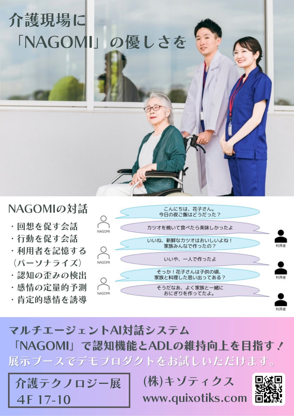 Quixotiks(キゾティクス)が独自開発した介護分野特化のAI対話システム『NAGOMI』デモプロダクトを東京ケアウィーク'25・介護テクノロジー展4F・17-10にて出展します