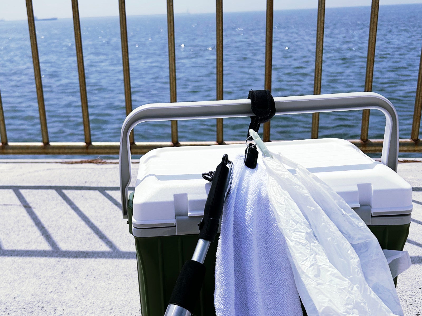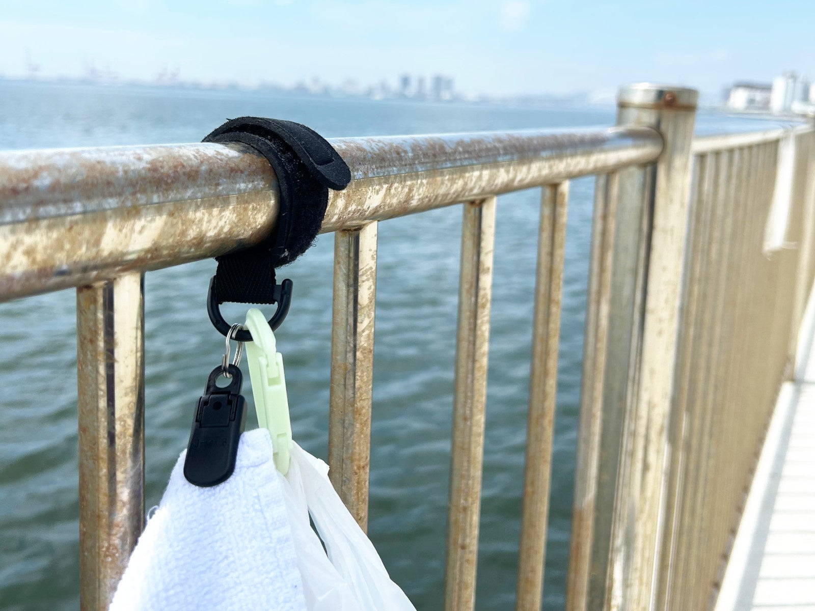 そこで弊社は、タオルやゴミ袋などを携行できる事でゴミ放置を少なくし、釣り人のマナー向上に貢献したい、かつ、釣り初心者にも手軽に使える便利グッズを提供する事で釣り人口増加に寄与したいと考え、タオルやゴミ袋など小物類を引っ掛けられる「グローバンド」を開発しました。