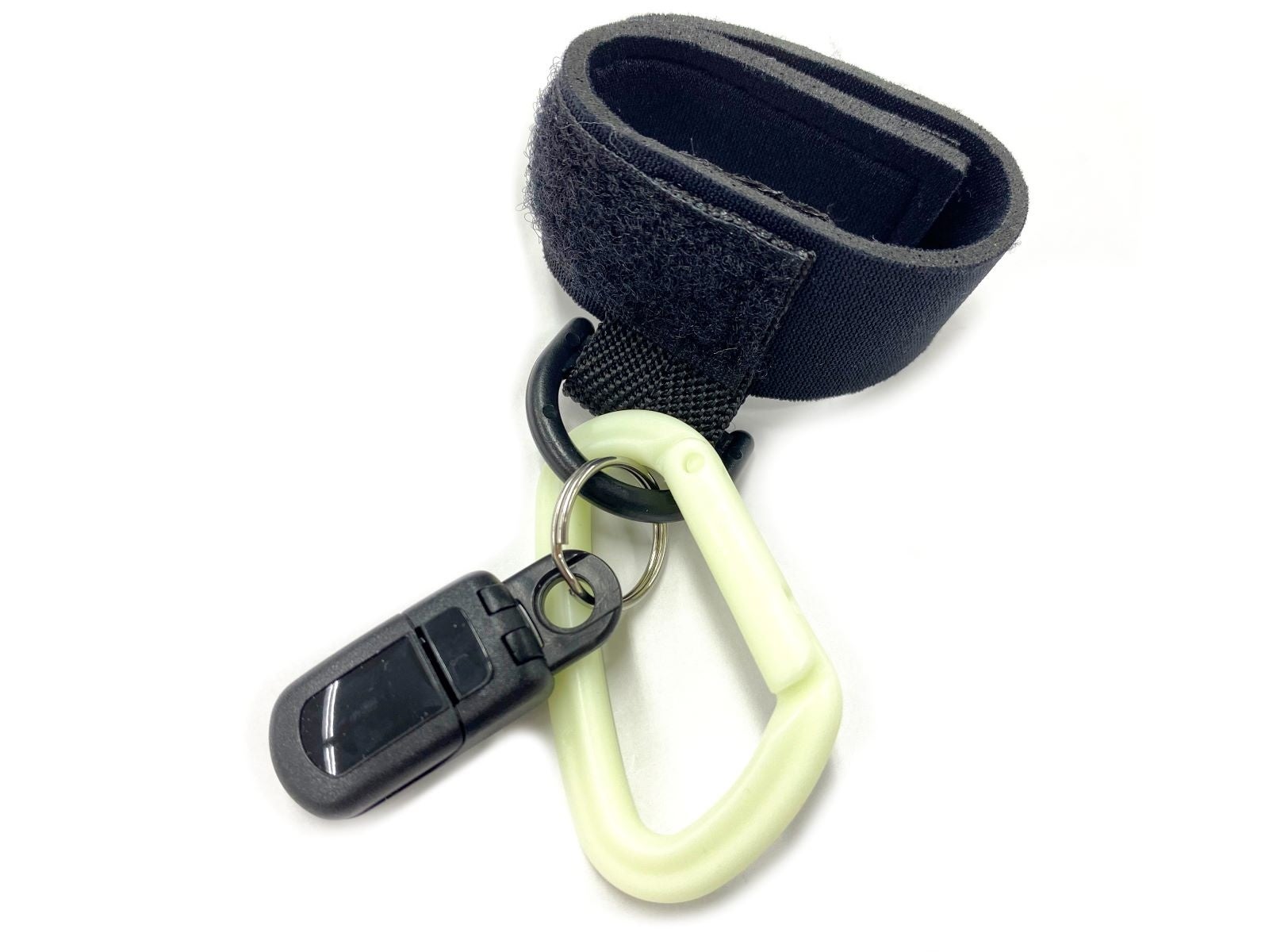 「グローバンド」は、クーラーボックスや釣り用バッグの持ち手に巻き付け、タオルやビニール袋などの小物を取り付けられる便利なバンドです。付属の蓄光カラビナは光を蓄え暗闇で発光するため、夜釣りや早朝釣りでの視認性を高めます。また、マジックテープには起毛タイプを使用することで、強度を向上させました。