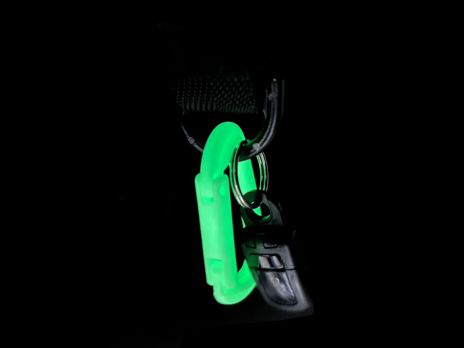蓄光とは、太陽の光や、蛍光灯などの光を蓄えて、暗闇で発光する性質です。蓄光性能は、JIS規格で分けられている【JCランク】の高輝度タイプのカラビナを使用しています。