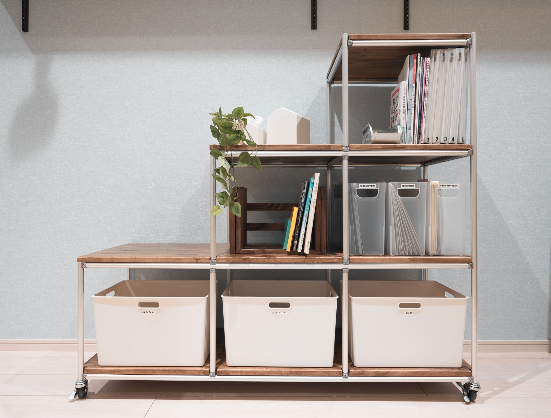 棚を用意する際も、なにを入れるのか明確に決めてから準備することが重要です。A4ファイルをいれたいのか、玩具を収納したいのか、ランドセルを置きたい等。そして収納は、定位置に戻せるようにゾーニングして置くのが大事です。特に限られたスペースを複数人で使用する場合は、ものがなくなってしまったり、別の場所にまぎれたり、出しっぱなしでスペースを上手く使えなくなってしまうことがあります。ラベリングすることで、何を入れる場所かを使う全員が理解することも大切です。