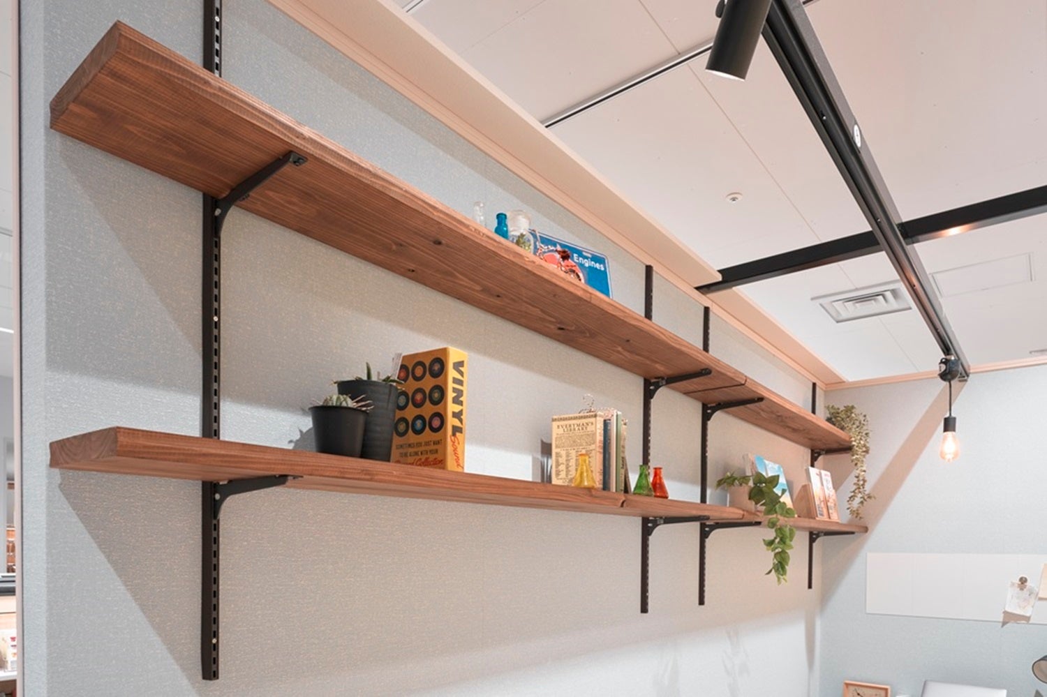 賃貸でも原状回復可能な石膏ピンで取り付けができる可動棚を設置。収納以外にも収集しているグッズなどを飾るスペースとしても活用できます。
