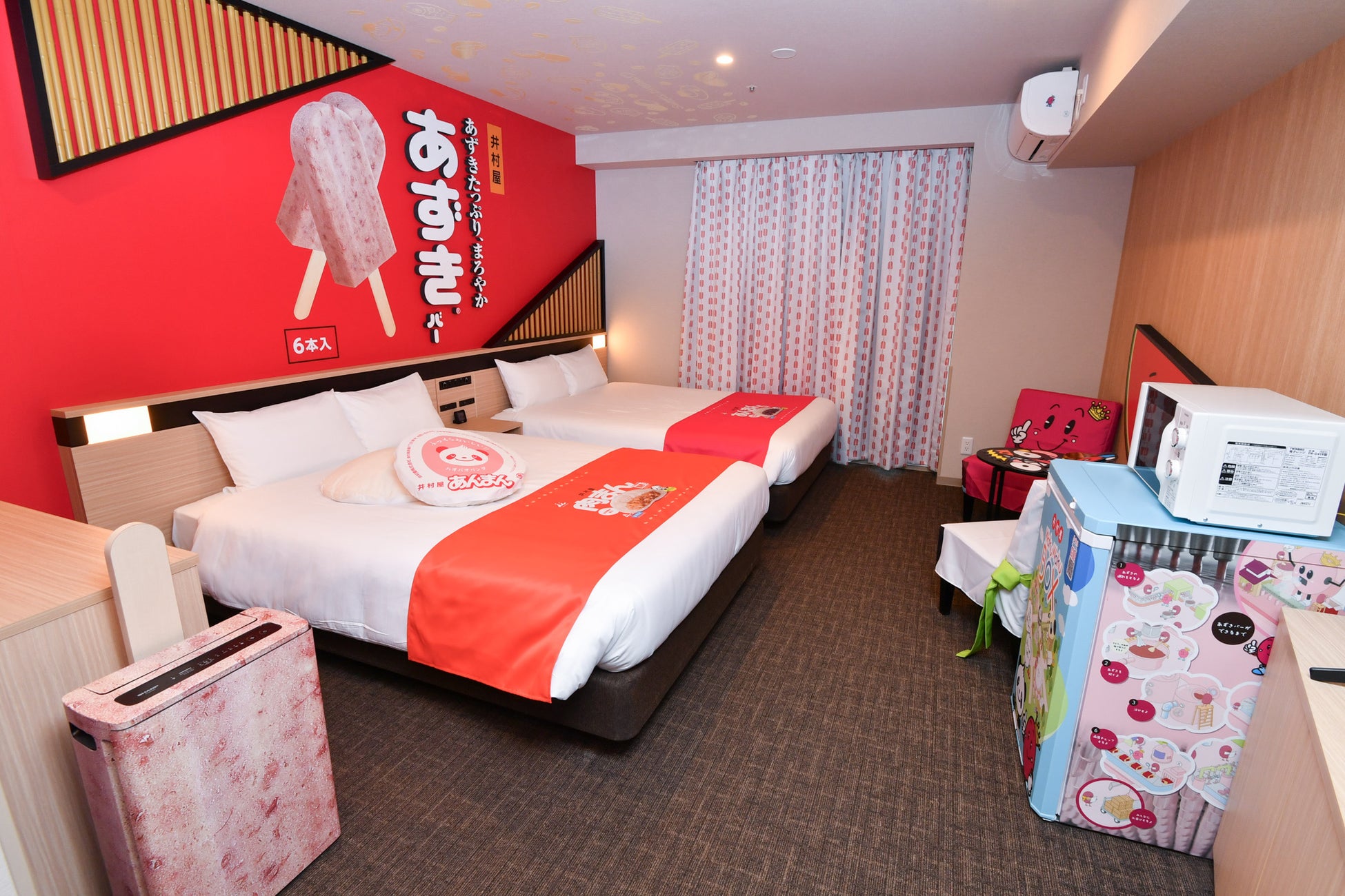 本客室は、「くつろぎと興奮が同居する」をテーマに、井村屋商品のデザインやキャラクターを随所に取り入れた特別な仕様に仕上げました。また、客室の冷凍庫に取り揃えた同社商品「肉まん」「あんまん」「あずきバー」は無料で召し上がっていただくことができます。当客室をご利用いただき、井村屋が展開する商品の魅力に触れていただければと存じます。