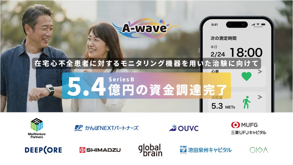 A-wave株式会社(本社:大阪府大阪市、代表取締役社長:桝田浩禎、以下「A-wave」)は、このたび、MedVenture Partners株式会社・かんぽNEXTパートナーズ株式会社・大阪大学ベンチャーキャピタル株式会社・三菱UFJキャピタル株式会社・株式会社ディープコア・池田泉州キャピタル株式会社がそれぞれ管理運営する投資事業有限責任組合、グローバル・ブレイン株式会社が運営する株式会社島津製作所のCVCファンド、および株式会社ギガ・システムを引受先として総額5.4億円の第三者割当増資を完了しました。