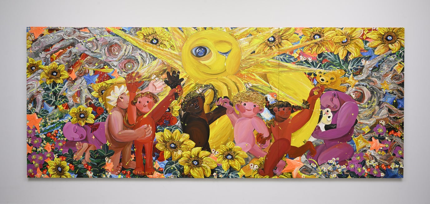 躍動感溢れる筆遣いと力強い色彩の絵画で知られる近藤亜樹(1987年―)の個展を開催します。近藤は、東日本大震災の余波に人々の心が揺らぐ2012年に画家としてデビュー。日常の事物や記憶に残る人々の面影、植物、幼子の言葉といったプライベートなモチーフから生と死や超越的な自然の力といったテーマまでを自身のなかに受け止め、それらを描くことで異なる者同士が「いま・ここ」につながり合う世界を展望してきました。ときに抗しがたい出来事に向き合い、他者の存在やつながりを感じ取るなかで生み出されてきたその作品は、小さくささやかな存在や名状しがたい兆しに光を当て、人間の感受性を呼び覚まします。本展では、生命の祝福、他者と共に在ること、2022年以降ますます切実さを帯びる災害や戦禍にある人々への想い、葛藤とレジリエンスなど、近藤亜樹の作品をとおして「生きること」と「描くこと」が切り開く世界に迫ります。