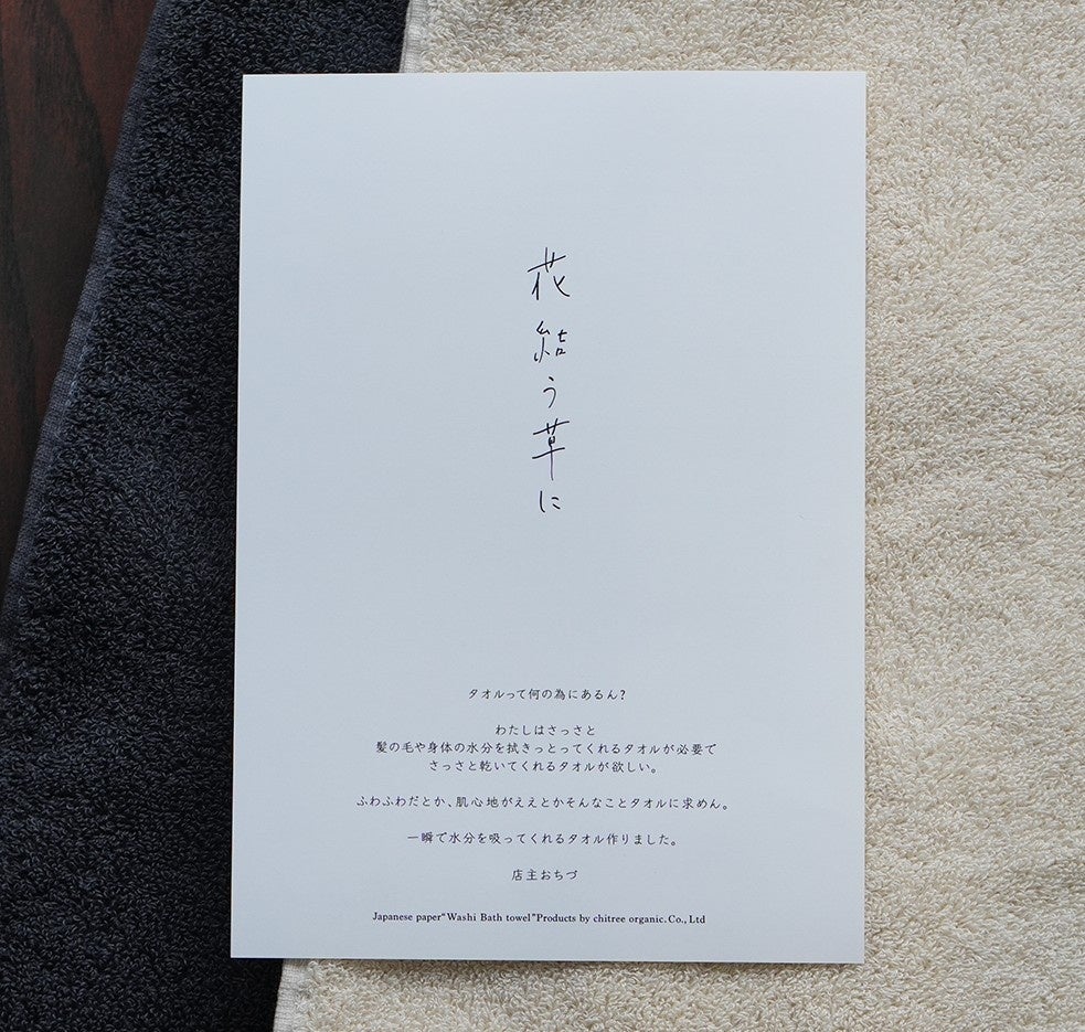 試作を繰り返して完成した和紙タオル「花結う草に」の名前には、「花」は綿花(コットン)、「草」は和紙を表し、両者を結びつけることで自然素材のもつ優しさと機能性を最大限に活かすという、店主おちづの思いが込められています。