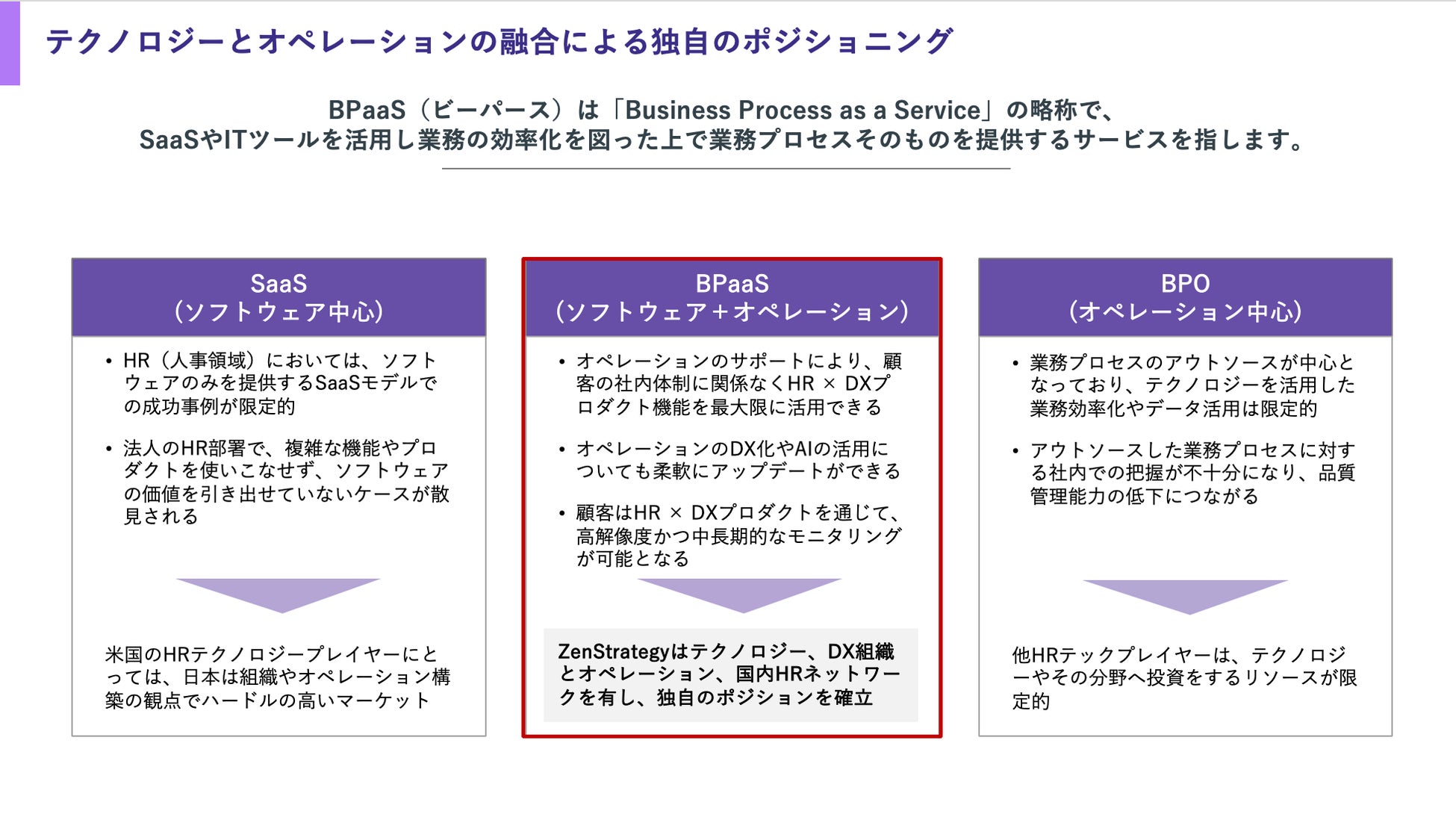 従来のBPO(業務プロセスのアウトソーシング)とSaaS(クラウド型ソフトウェア)を融合した新しいビジネスモデルであるBPaaS(Business Process as a Service)は、業務のDX化と効率化を実現するソリューションです。ZenXの人事BPaaSは、ZenTestを中心に据えたデータドリブンな採用アプローチにより、企業が抱える採用課題に革新的な解決策を提供します。