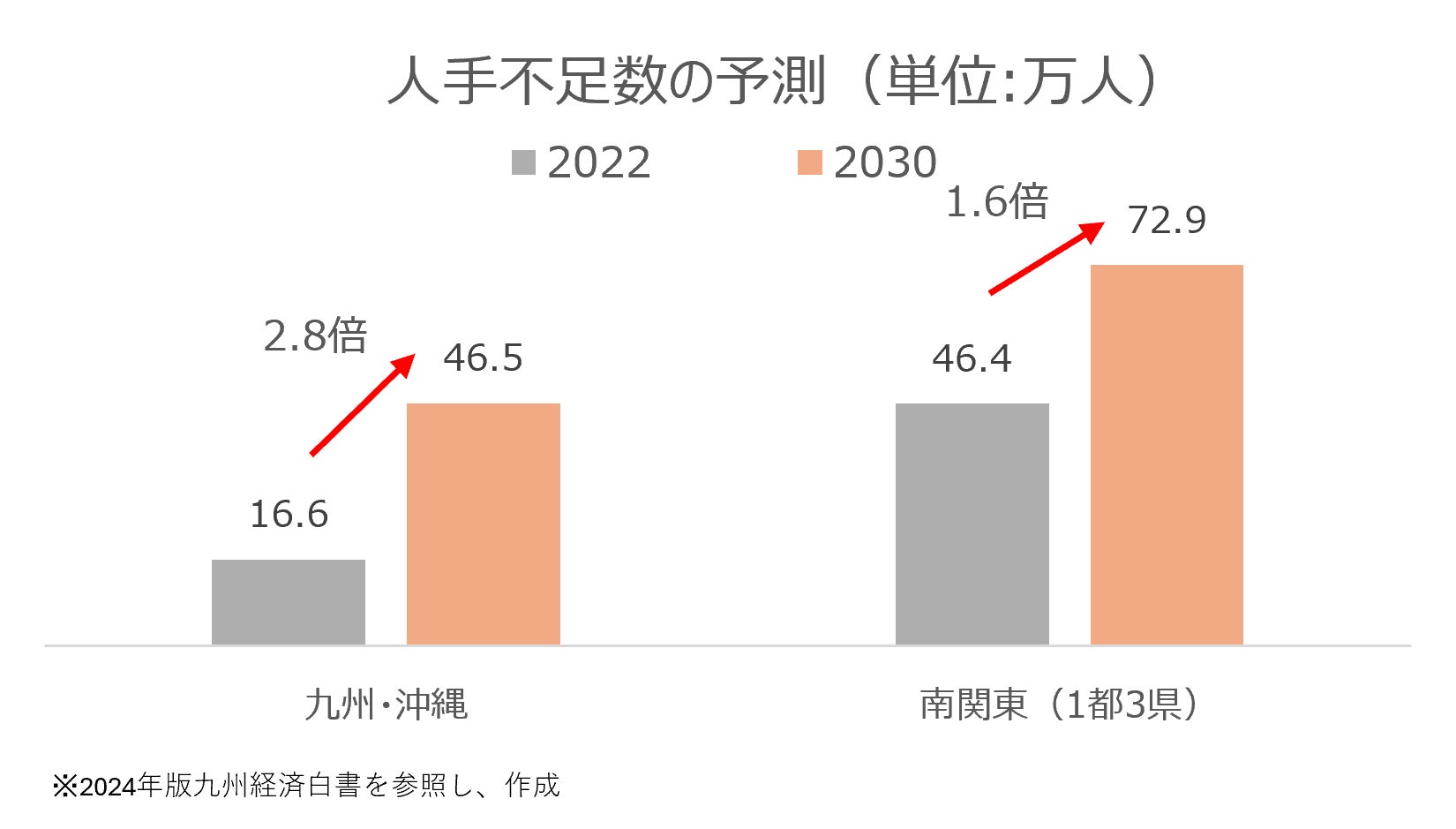 九州経済調査協会がまとめた『2024年版九州経済白書』によると、九州・沖縄では2030年に22年の2.8倍の46.5万人が不足すると推計されており、労働力不足の深刻化が予測されています。