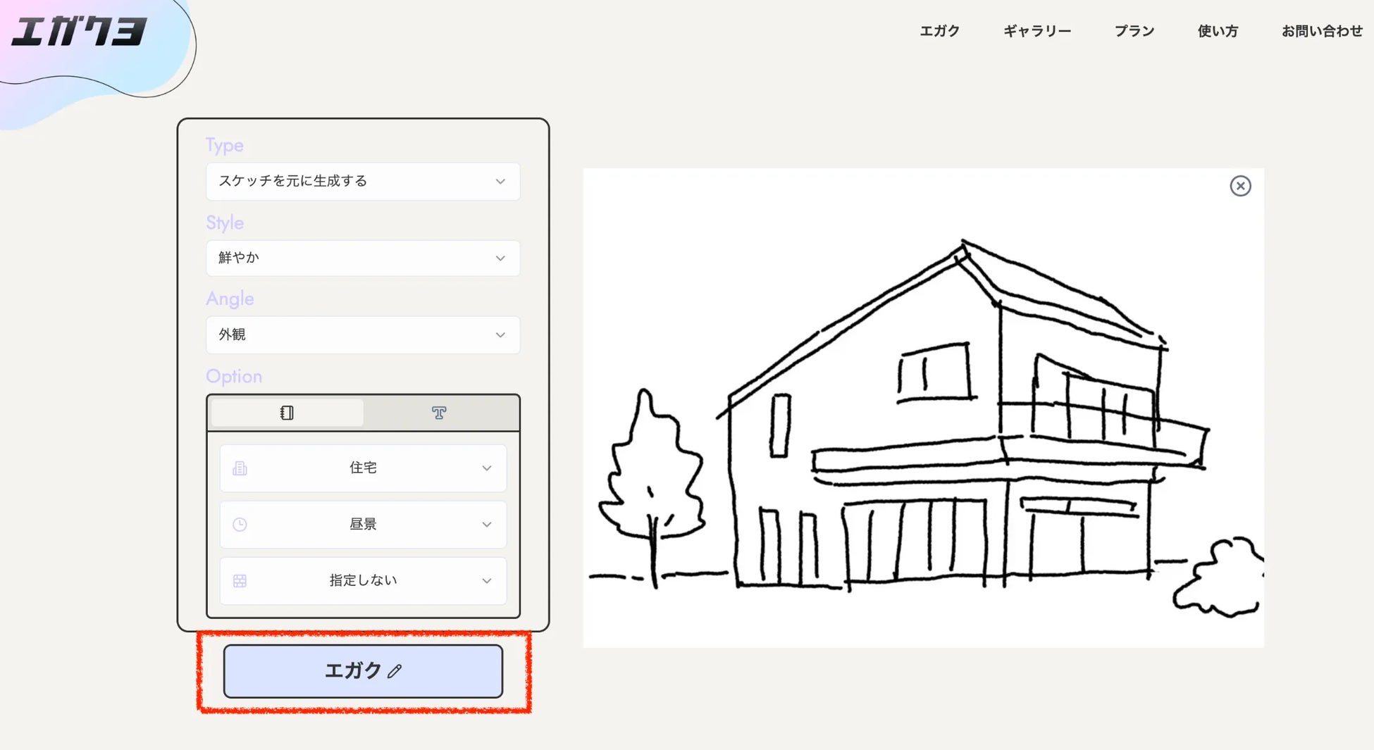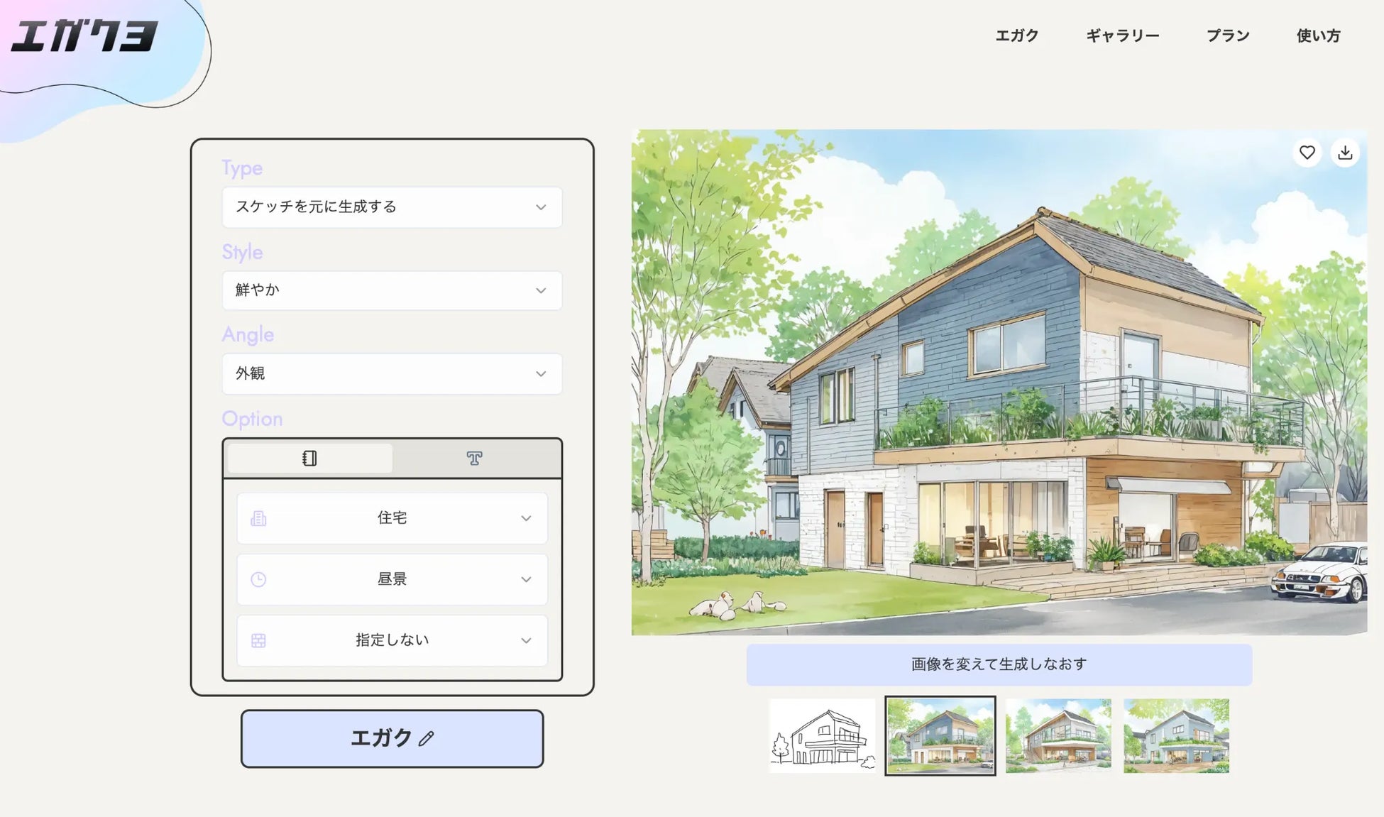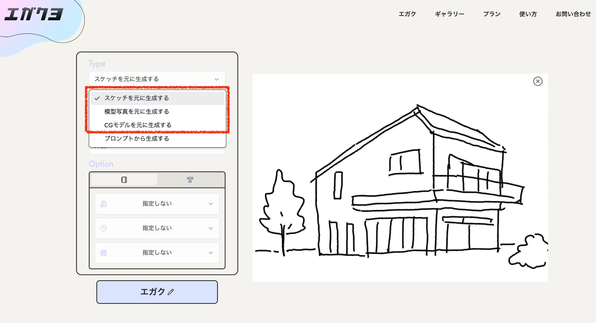 エガクヨでは、ラフスケッチや模型写真、CGなどの元画像から生成する方法と、プロンプトのみから生成する方法の、大きく2種類の生成方法をお選びいただけます。今回は元画像のある生成方法の使い方を説明させていただきます。