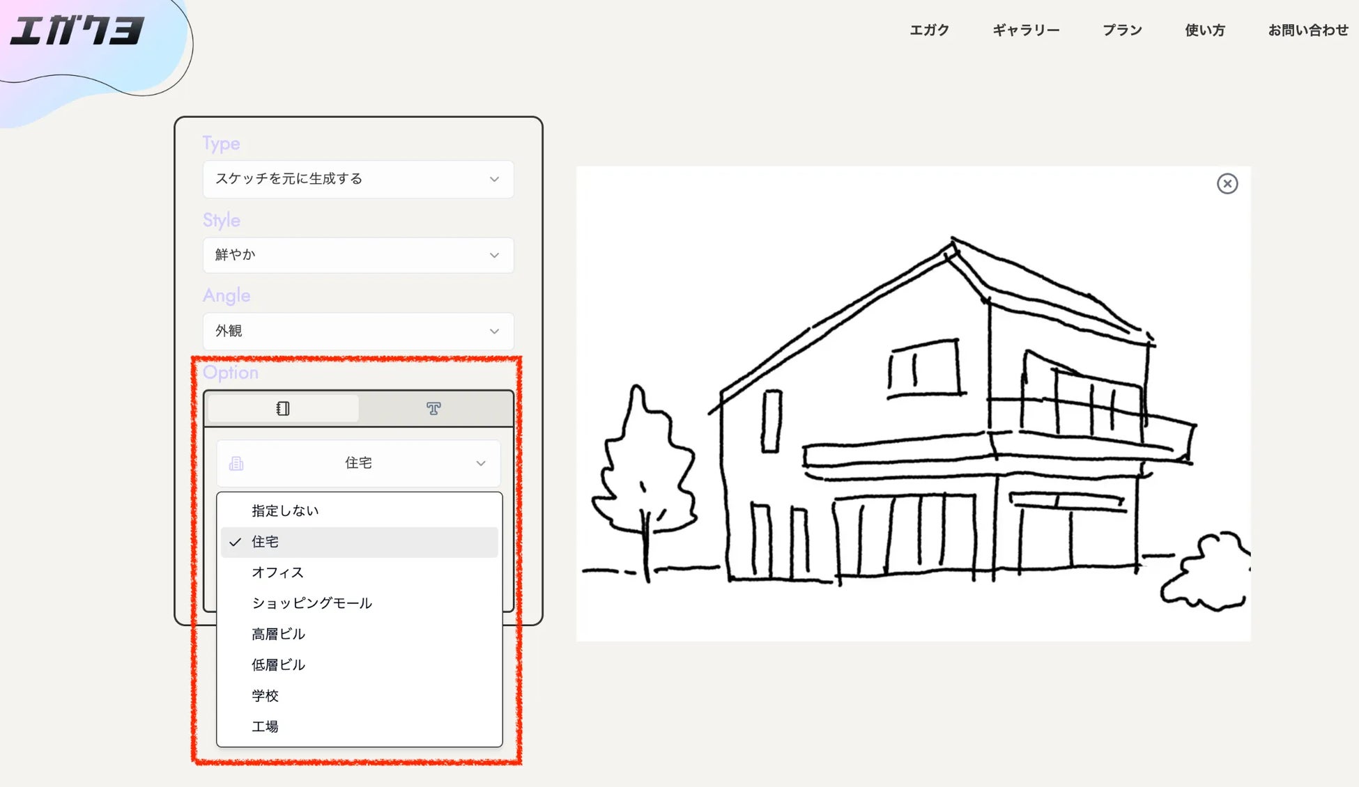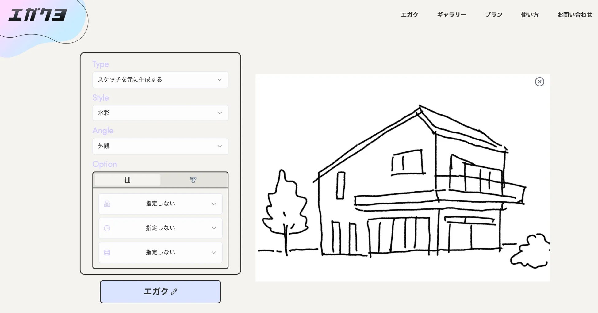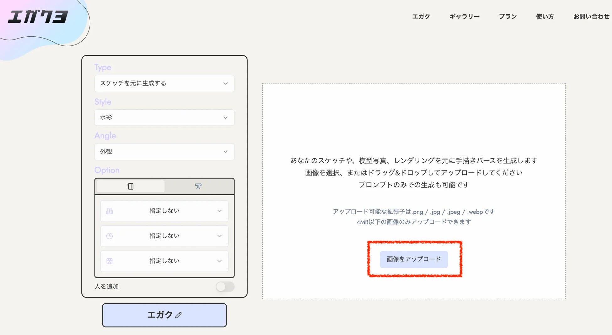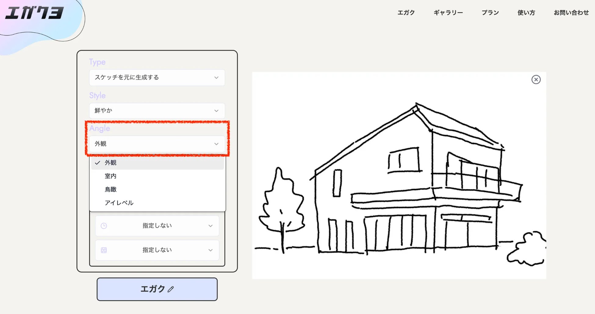 エガクヨでは、ラフスケッチや模型写真、CGなどの元画像から生成する方法と、プロンプトのみから生成する方法の、大きく2種類の生成方法をお選びいただけます。今回は元画像のある生成方法の使い方を説明させていただきます。