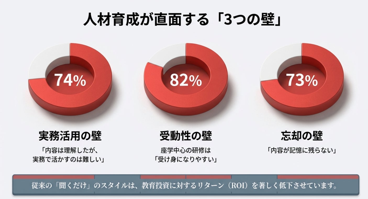 ・「忘却」の課題:73%が「内容が記憶に残らないこと」を課題に。従来の「聞くだけ」の研修スタイルは、教育投資に対するリターンの面で大きな課題を抱えています。