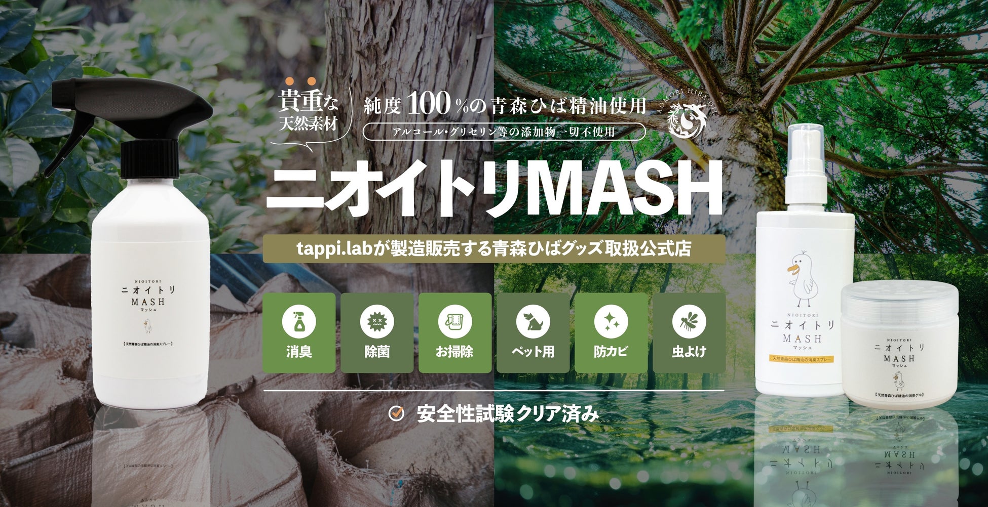 当社では”青森ひば精油”を使用した商品を”ニオイトリMASHシリーズ”として、お掃除・洗濯・消臭・除菌といった用途でご家庭でお使い頂ける製品として販売していく他、精製段階で産出される“青森ひば水”についても製品かして行く予定です。貴重な資源である「青森ひば」を無駄なく使えるよう今後も製品開発を行って参ります。