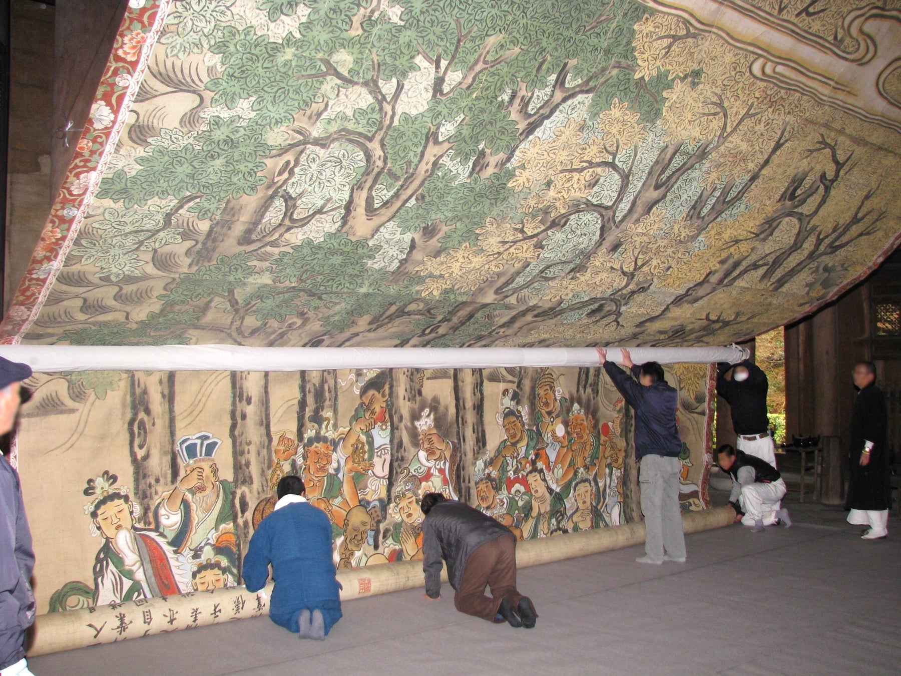泉涌寺(京都市東山区)では、お釈迦様の入滅日に行う法要、涅槃会を3月14日より16日まで、泉涌寺仏殿にて毎年行っています。お釈迦様が沙羅双樹の木の下で、信者たちに囲まれて静かに旅立たれた様子を経典に基づき描いたのが「涅槃図」。泉涌寺の大涅槃図は縦15.1㍍×横7.3㍍、重さ150㎏あり日本最大級の大きさです。江戸中期の浄土宗僧侶で多くの優れた画を描いた明誉古礀(みょうよこかん・1653~1717)により奉納されました。