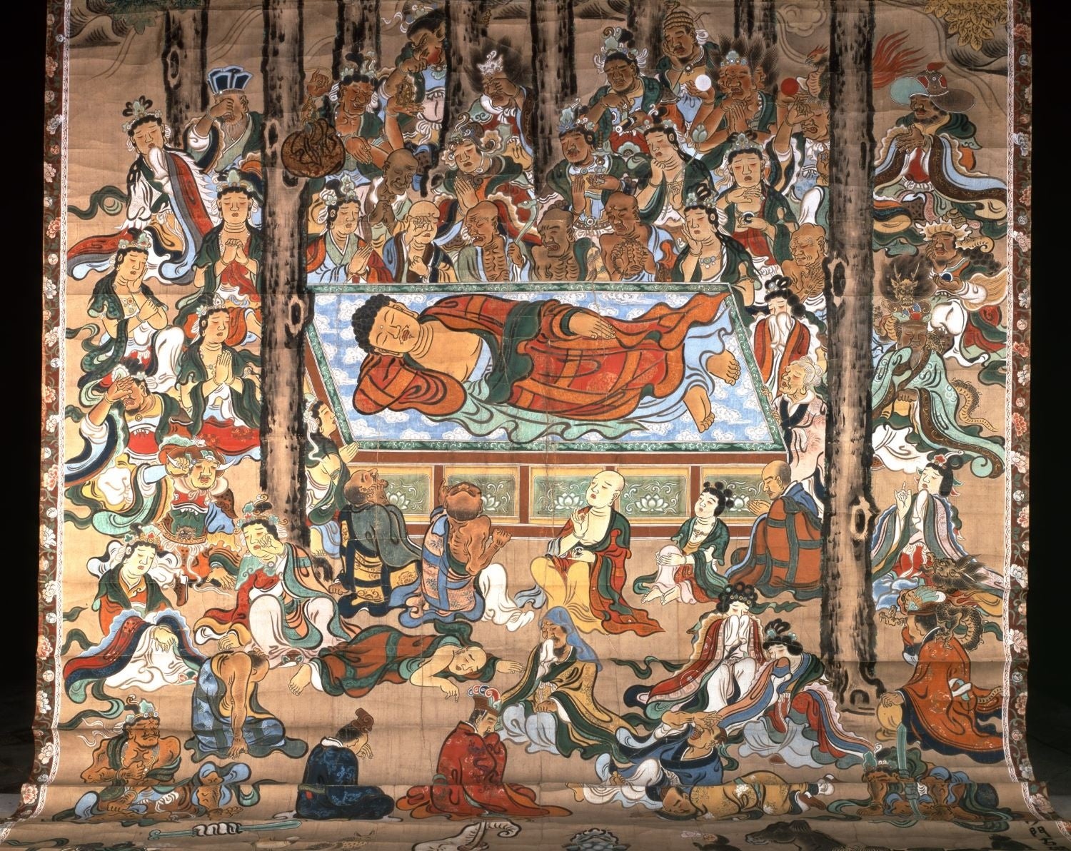 頭上には月や雲、下に伏す動物たち、眼前に横たわるお釈迦さま、そして周囲の菩薩・諸天や弟子達、悲しむ人々は私達と同じくらいの大きさで描かれており、それにより私達自身もこの画と一体となり、涅槃の場に立ち会う臨場感に包まれます。