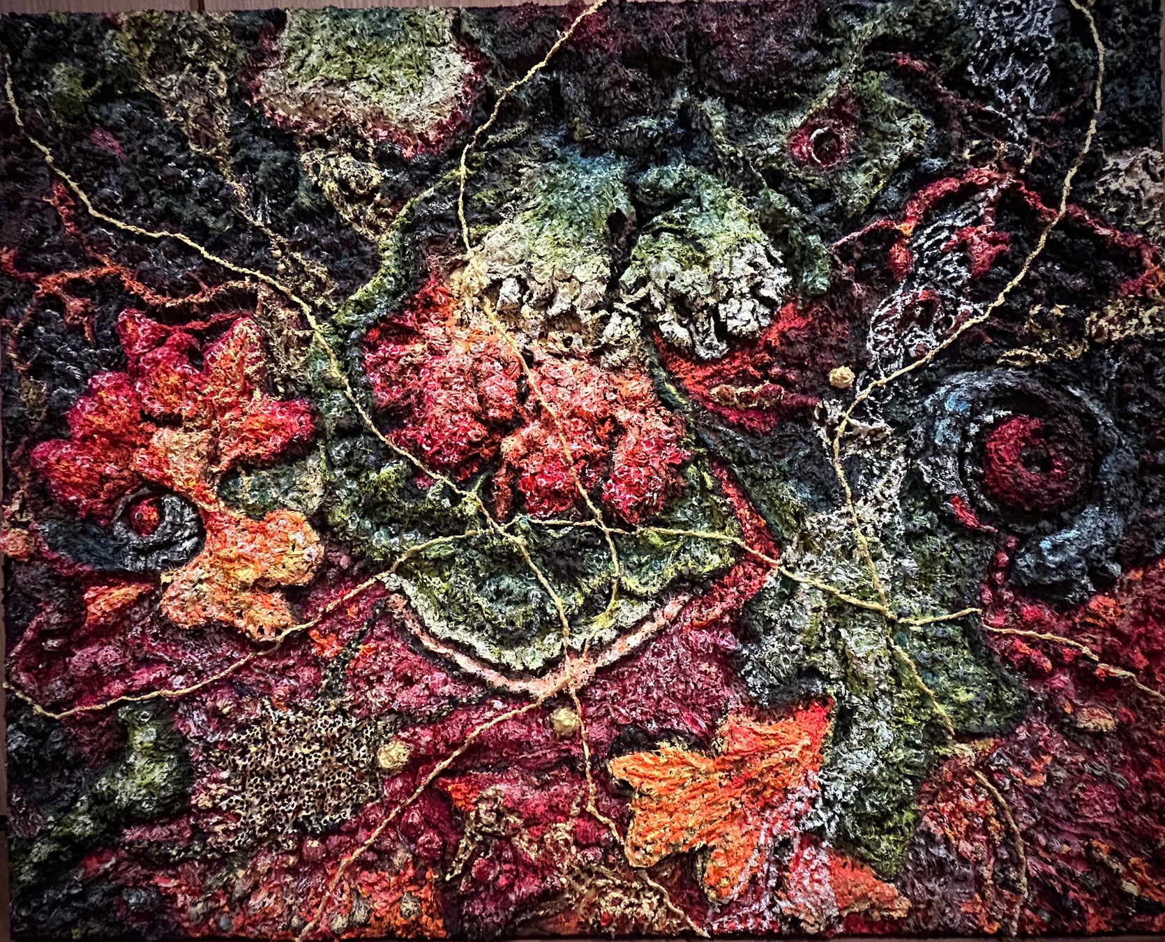 まだ解明されていない未知のものに想像力が入り込み、感覚的に画面に表したもの。幾重にも色を重ね、経年変化によりゆっくりと変化を遂げていくよう作品を仕上げている。経年変化に想像力が入り込む余地が生まれる。