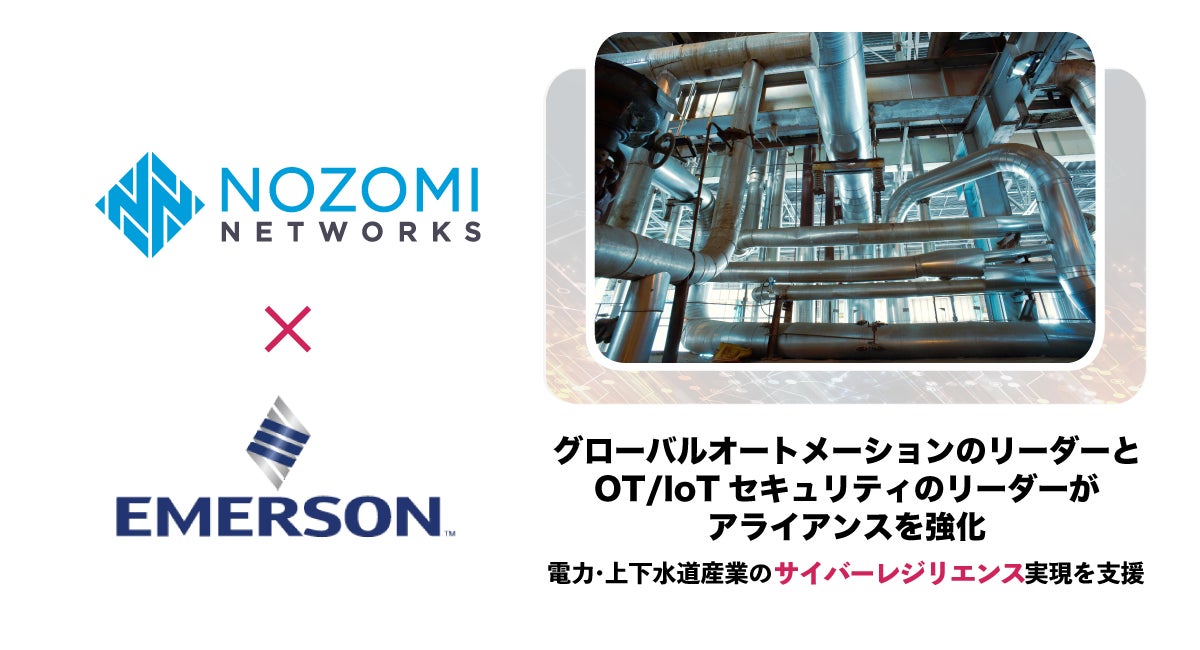 OT/IoT セキュリティのリーダーである Nozomi Networks (本社: 米国サンフランシスコ、日本カントリーマネージャ: 芦屋悠司) は、2024年 10月 15日、グローバルオートメーションのリーダーである Emerson と、電力および上下水道産業における OT サイバーセキュリティサービスおよびソリューションに対する需要の高まりに効果的に対応するため、契約を更新しアライアンスを強化したことを発表しました。Emerson は、Nozomi Networks の産業用制御 (OT) システムのサイバーレジリエンス* とリアルタイムの運用可視性のための高度なソリューションを、Emerson の Ovation(TM) Automation Platformの世界中の顧客に提供します。今回の契約は、Nozomi Networks の OT/IoT に関する専門知識と Emerson の業界専門知識、電力および上下水道産業に向けたサイバーセキュリティソリューションとサービスを組み合わせて、顧客のサイバーセキュリティ体制を強化し、サイバー攻撃やプロセス異常によるダウンタイムのリスクの軽減を支援するものです。