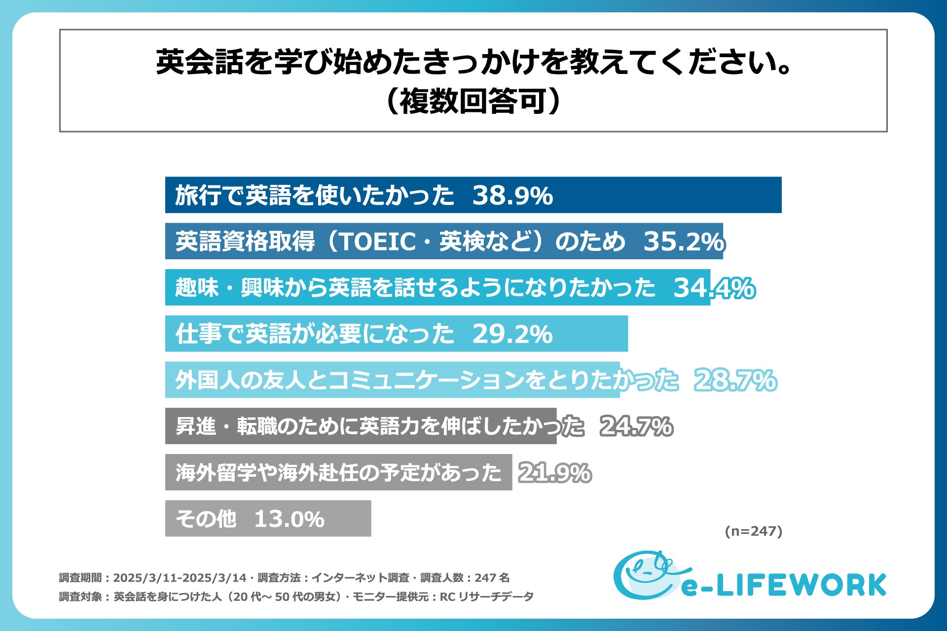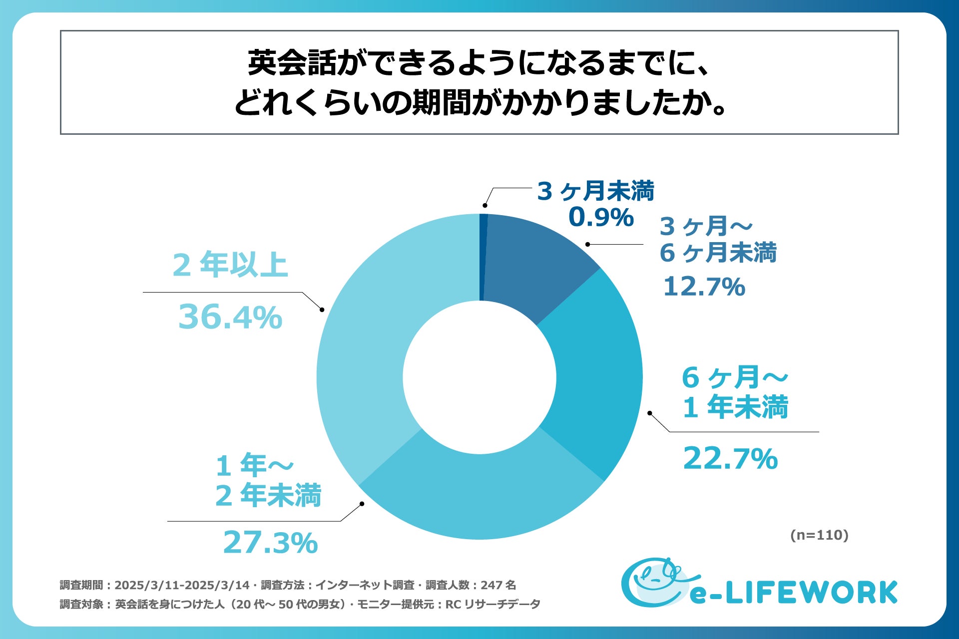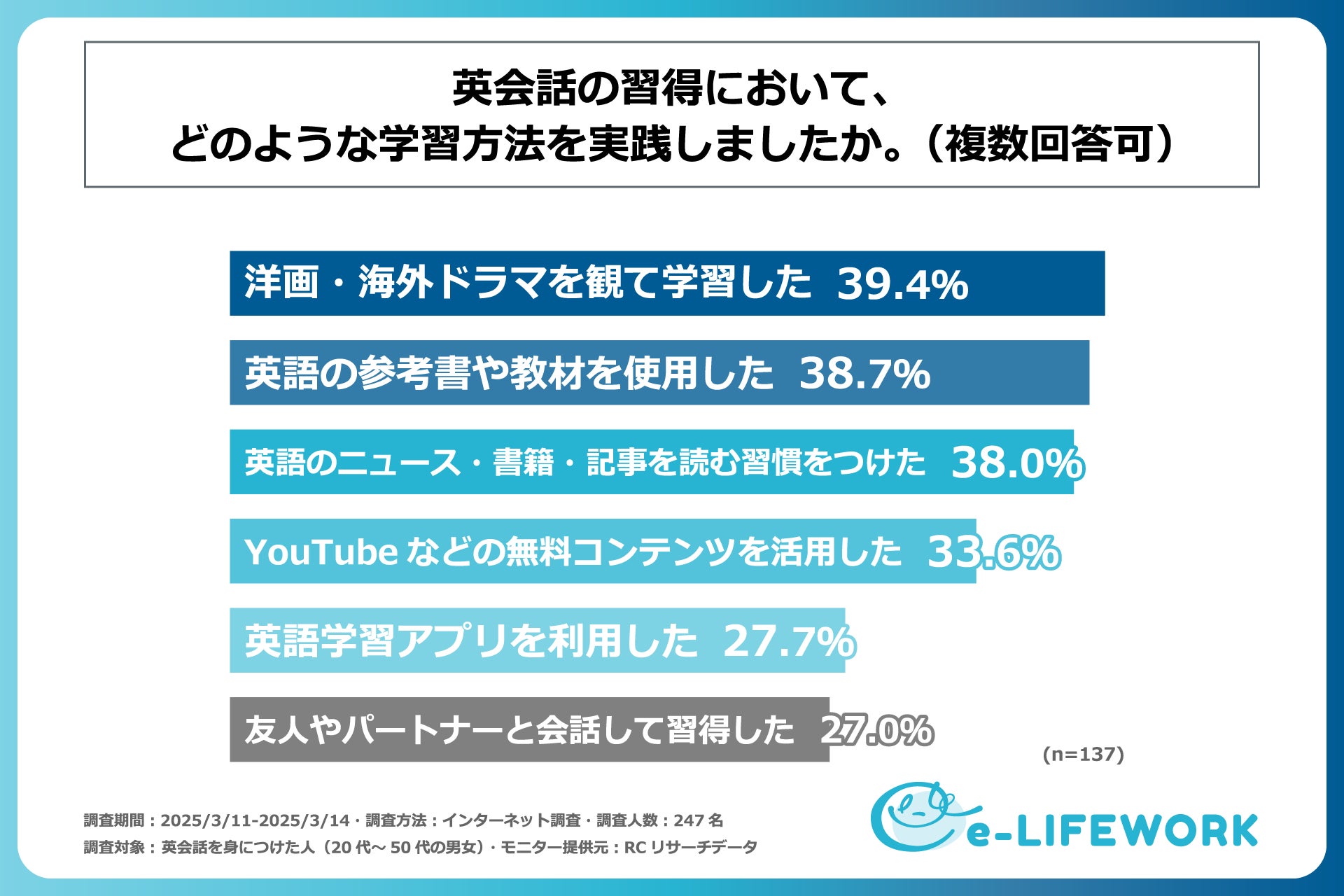 近年、グローバル化が加速する中で、英会話スキルの必要性が一層高まっています。特に、4月の新年度を迎えるにあたり、新たな環境でのスタートを控え、「何か新しいことを始めたい」と考える人も多いのではないでしょうか。その中でも、キャリアアップや自己成長の一環として、英会話の習得に取り組む人は少なくありません。しかし、英会話の習得方法にはさまざまな選択肢があり、独学で学べるものなのか、また、英会話スクールは効果があるのか、といった疑問を抱く方もいるものと考えられます。では、実際に英会話を習得した人々はどのような学習法で、どのくらいの時間を費やして英会話を習得したのでしょうか。そこで、株式会社e-LIFEWORKは、英会話を習得した方を対象に「学習方法とその効果」に関する実態を明らかにするための調査を実施しました。
