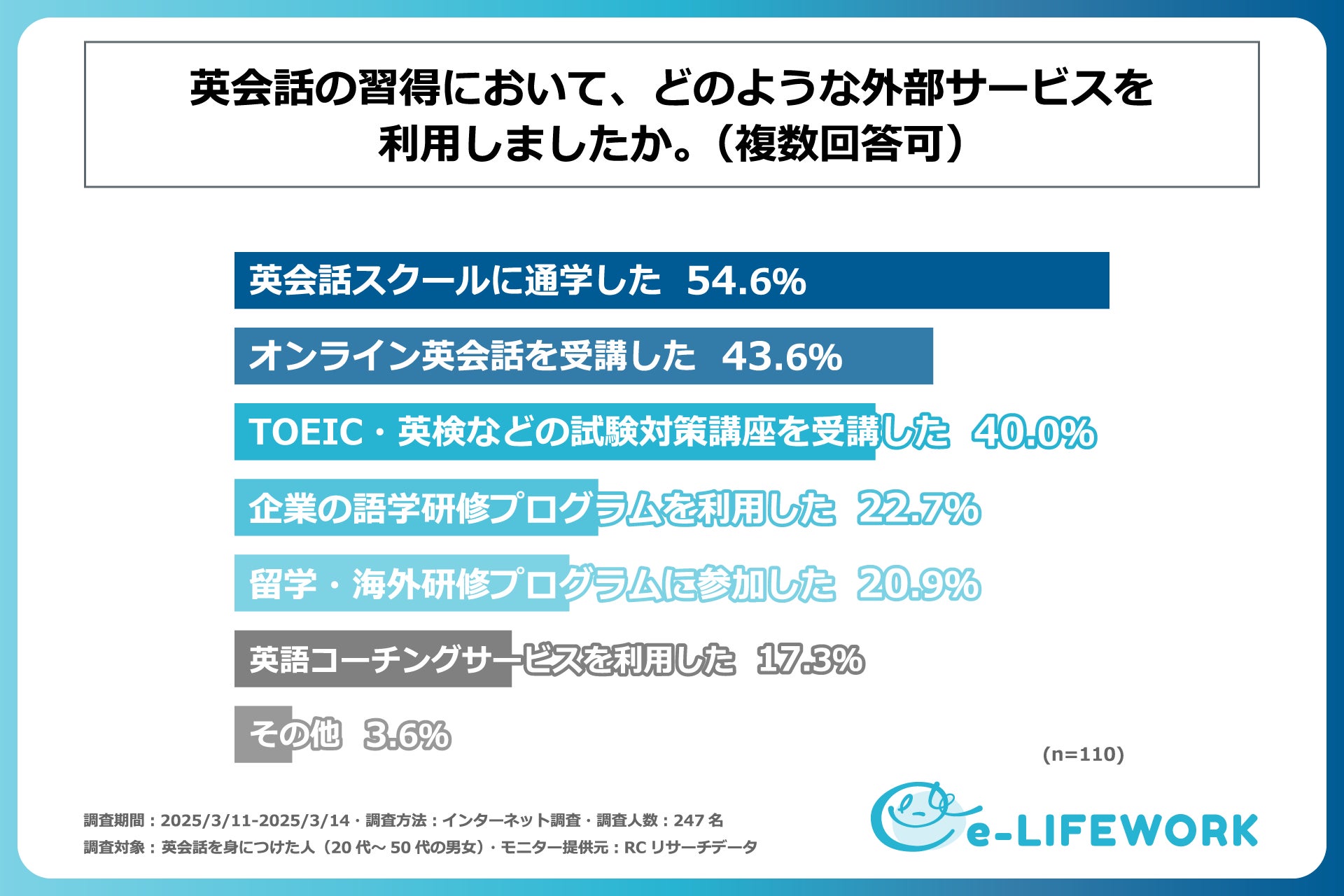 英会話を身につけた人の内、4割強の人は英会話教室などの外部サービスを活用している!株式会社e-LIFEWORKが「英会話習得者の学習実態調査」を実施!