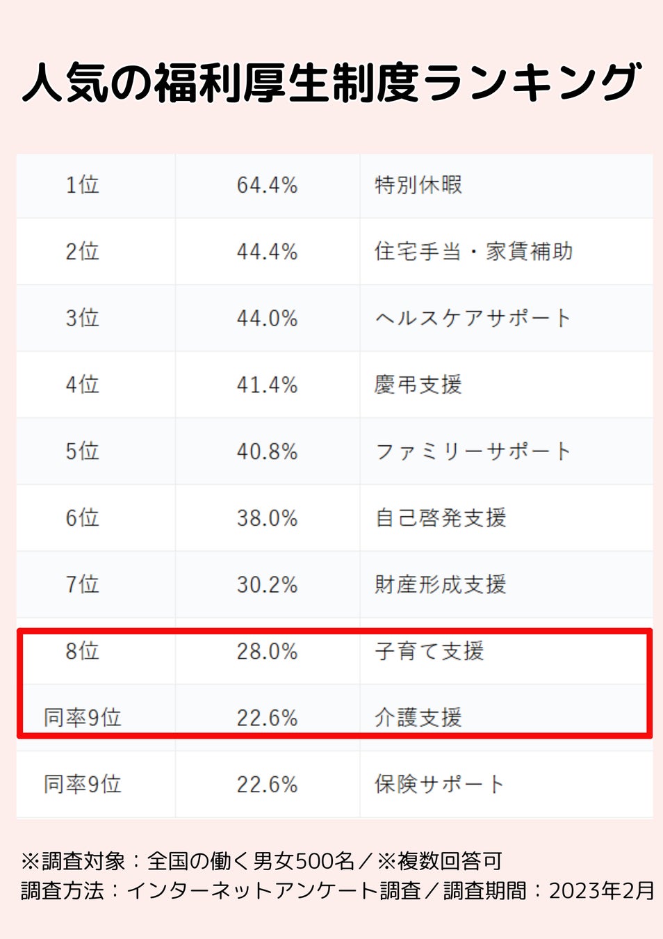 現在、核家族化や働く世帯の増加に伴い、子育てや介護の支援を求める声が多く、社員の求める福利厚生制度のサービスはライフステージによって大きく変わっていきます。ウォンテッドリー株式会社が行った2023年2月のインターネットアンケートによると、働く男女500人の【人気の福利厚生制度ランキング調査】では、第8位および第9位に子育てと介護支援がランクインしています。