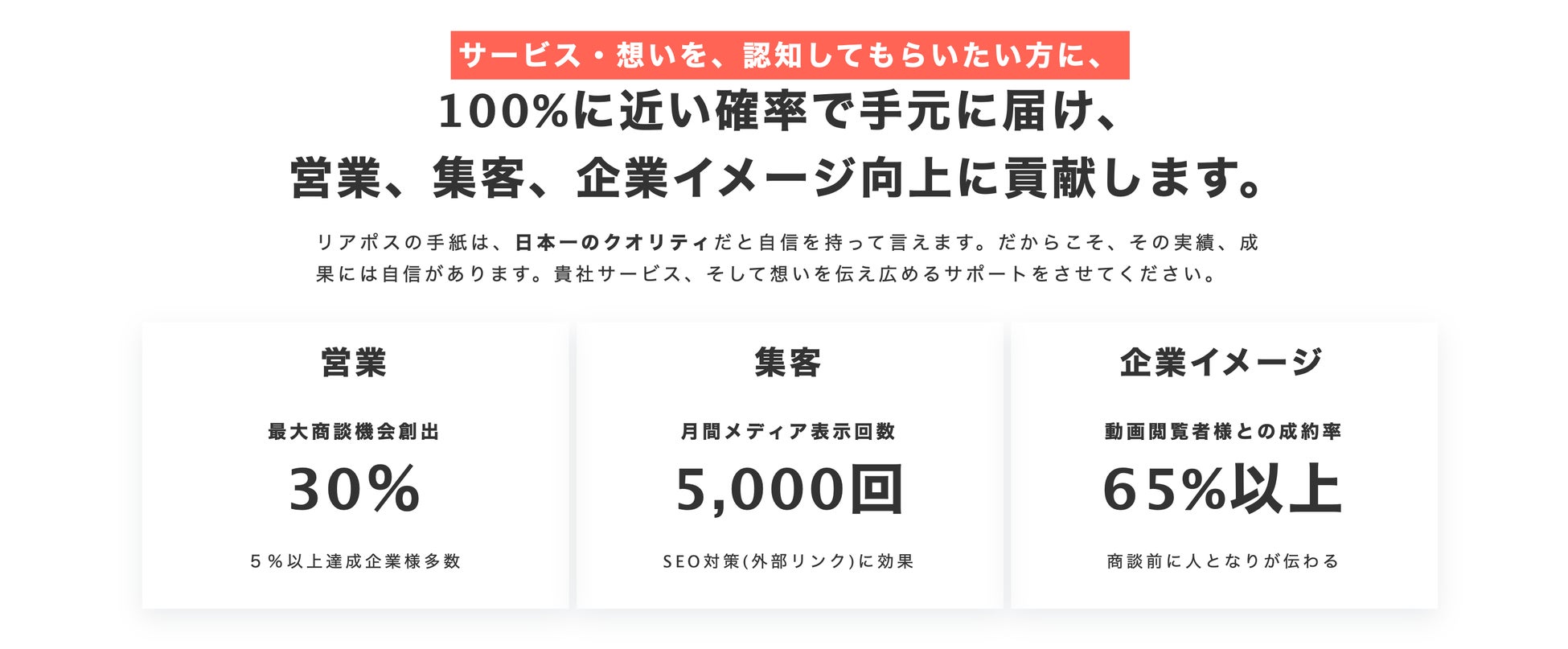 リアポスは「1通の直筆手紙を決裁者(社長、役員、部長)の手元に届け、メディア、動画」を連動させたPRサービスです。リアポスの一番の強みは「PRしたい方に100%に近い確率で直接認知につながる」ということです。その結果3つの効果が見込めます。