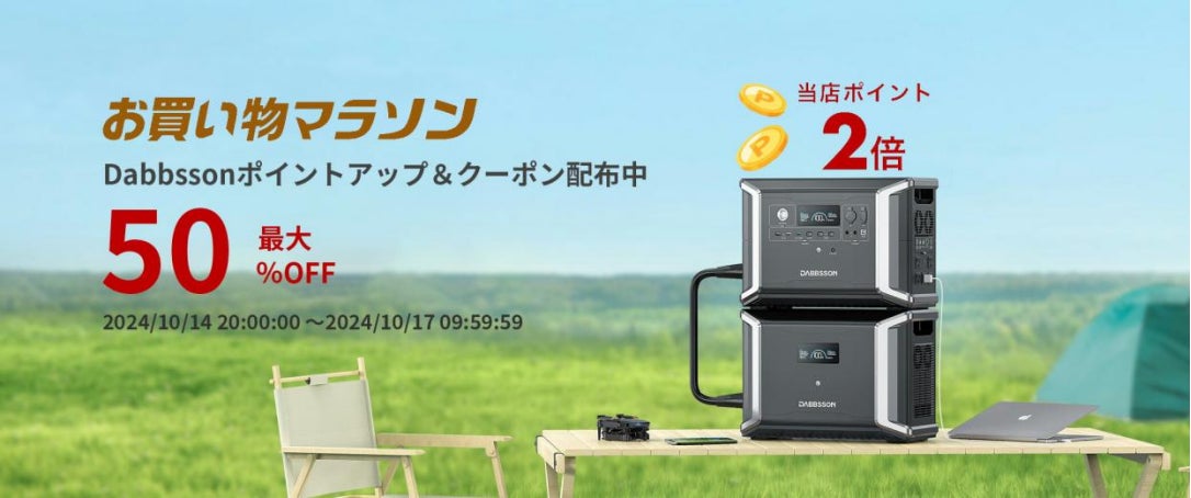 Dabbsson公式Amazon直販店の他に、Dabbsson公式サイト店舗、公式楽天市場直販店において、【秋の大感謝セール9/20(金)~10/16(水)】と【お買い物マラソン10/14(月)~10/17(木)】の活動があり、Dabbsson製品も最大50%OFFでご購入いただけます。この機会で、Dabbssonのポータブル電源やソーラーパネルを手に入れて、素敵な秋のアウトドアライフを楽しみましょう!