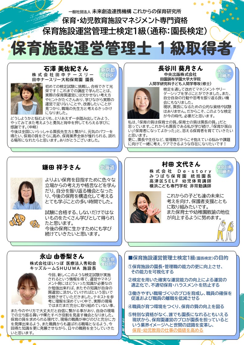 一般社団法人 未来創造連携機構 これからの保育研究所(本部:神奈川県川崎市高津区、代表理事:斉藤 和琴)は、保育施設運営管理士検定1級(通称:園長検定)の実施を経て、14名の保育施設運営管理士(1級)を認定しました。