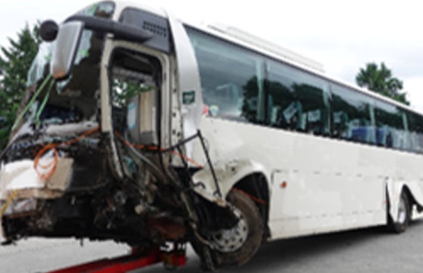 大型貸切バスが「ふじあざみライン」つづら折りの急勾配の道路を走行中、フェード現象が発生し、制動力を失いカーブを曲がりきれず横転。