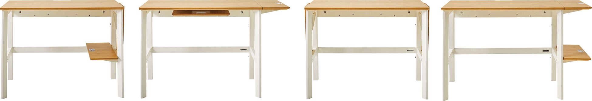 2枚の補助天板の付け替えでデスク幅を900mm、1100mm、1300mmの3サイズで使えます。奥行きは450mmでリビングに置いても場所を取りにくく使いやすいサイズです。転居や模様替えなどでデスクの設置場所が変わっても、使用環境に最適なデスク幅に調整できます。