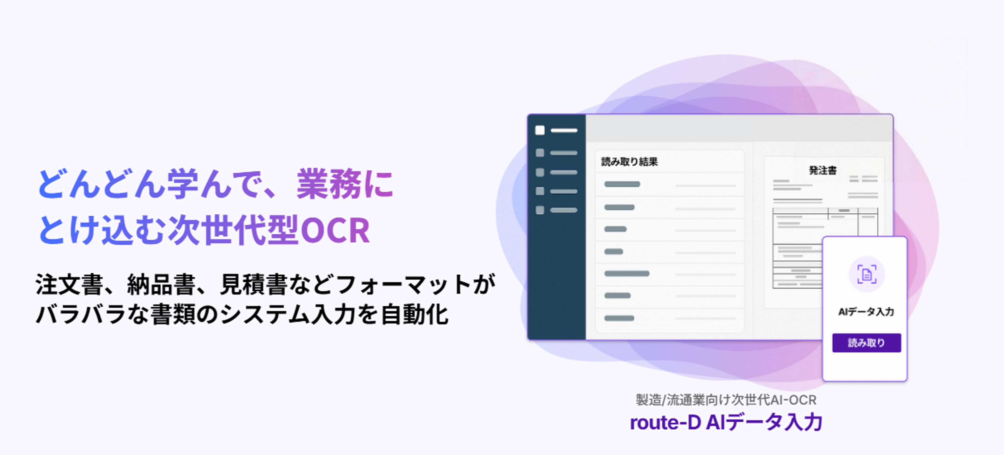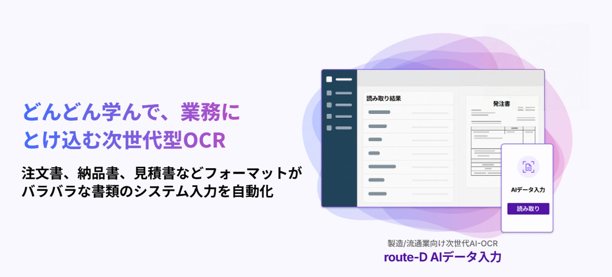 その第一弾として "どんどん学んで業務にとけ込む次世代型のOCR"「route-D AIデータ入力」を2025年にローンチし、既に50社以上との取り組みが進捗しております。また導入企業では、これまで人間が実施してきた入力業務の工数を90%削減し、人間は人間にしかできないコア業務に専念することができています。